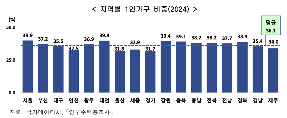 - 🏙️ 전체 가구 중 1인 가구 비율을 지역별로 살펴보면 서울(39.9%)이 가장 높았고요. 대전(39.8%), 강원(39.4%), 충북(39.1%)이 뒤를 이었어요.