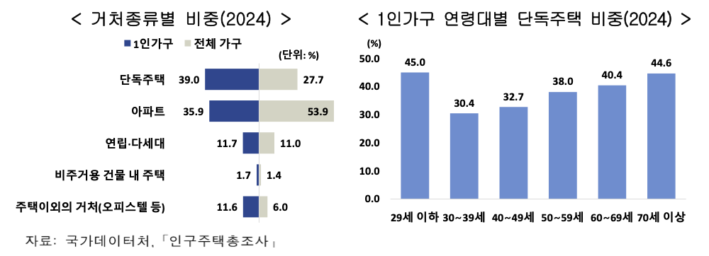 - 🏠 거주 형태는 단독주택이 39.0%로 가장 많고, 아파트가 35.9%로 뒤를 이었어요. 전체 가구의 절반 이상(53.9%)이 아파트에 사는 것과는 다른 모습이에요.
