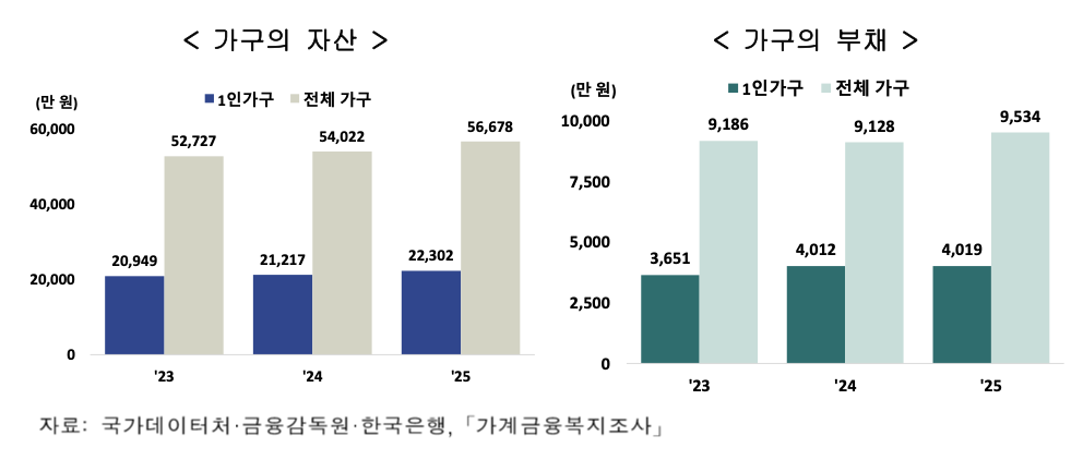 - 💰 1인가구는 소득·자산·부채 모두 전체 평균보다 낮은 걸로 나타났어요. 1인가구 중 연 소득 3000만 원 미만 가구가 절반 이상(53.6%)이었고요. 평균 자산은 자산은 지난해보다 5.1% 늘어난 2억 2302만 원으로, 전체 가구(5억 6678만 원)의 39.3% 수준이었어요.