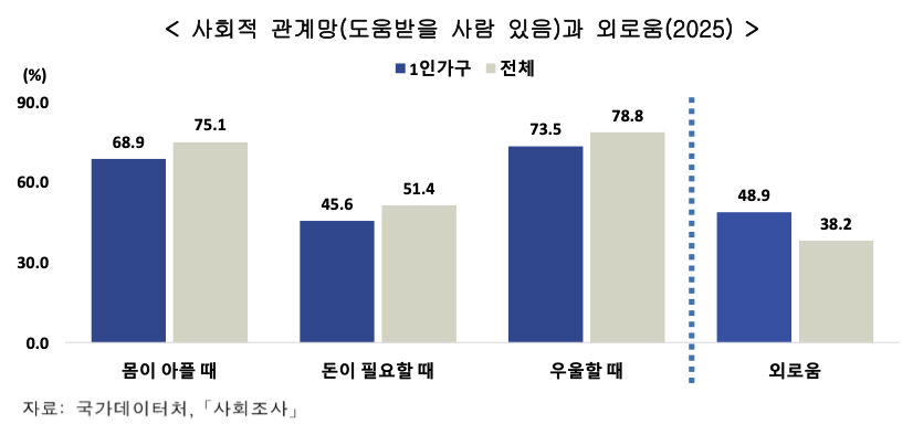 - 😢 외로움을 자주 느낀다는 응답은 48.9%로 전체 평균보다 10.7%p 높았고요. 우울할 때 도움받을 수 있다고 답한 비율은 73.5%로 전체 평균(78.8%)보다 낮았어요.