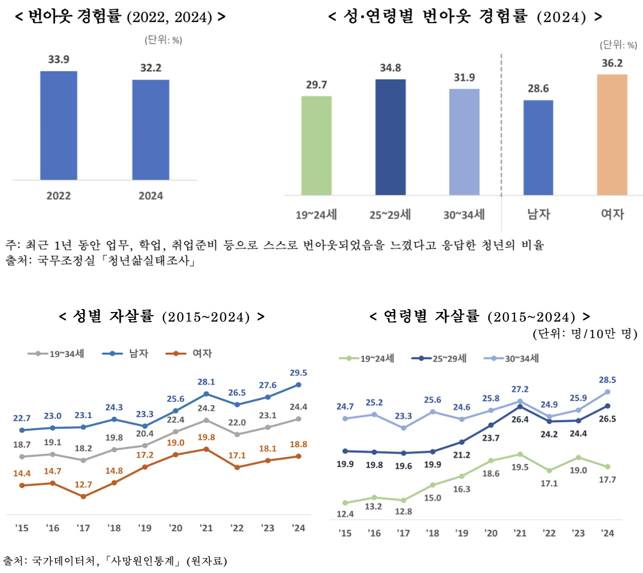 - 자살률은 30% 급증 📈: 지난해 기준 청년 자살률은 10만 명당 24.4명으로, 2015년 이래 최고치를 기록했어요. 남성이 10만 명당 29.5명으로 10만 명당 18.8명인 여성에 비해 크게 두드러졌는데요. 연령별로는 30~34세의 자살률(28.5명)이 가장 높았어요.