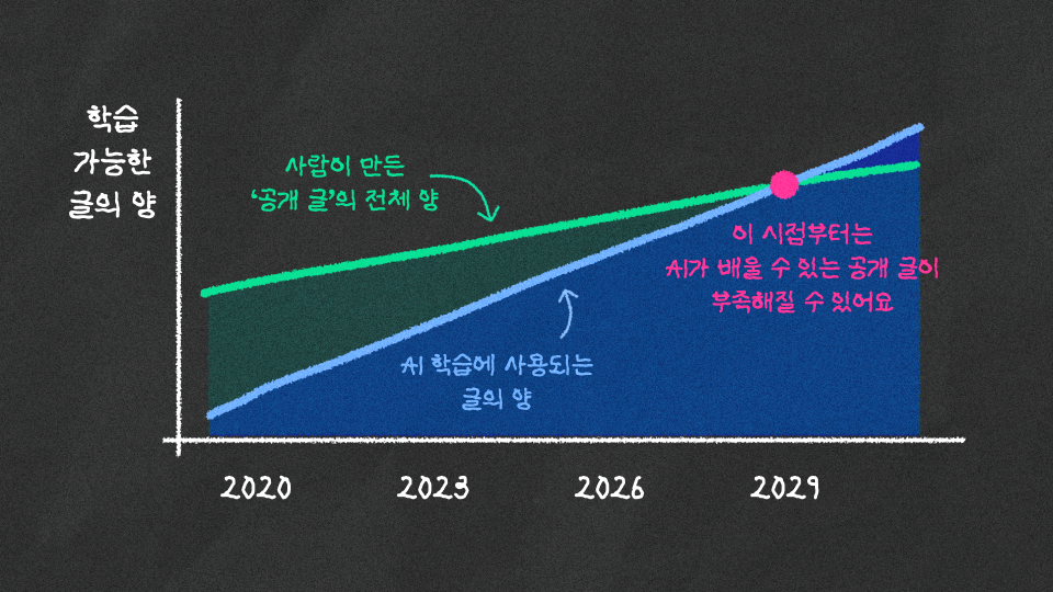 중요한 건 AI의 발전에 대해 다시 생각해봐야 하는 때를 맞았다는 거예요. 인터넷의 무궁무진해보이던 자료를 똑똑한 모델로 빠르게 학습하며 AI를 성장시켰던 기존의 문법이 곧 힘을 잃게 될 걸로 보이기 때문.