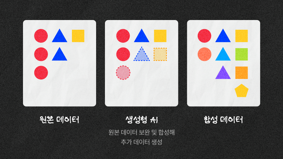 가장 간단한 해결 방법은 ‘새로운 고품질의 인간 생성 데이터를 더 모으는 것’이에요. 하지만 저작권 등 현실적인 한계가 있기 때문에 업계와 연구자들은 새로운 방법을 찾고 있어요. 새로운 데이터를 더 모으기보다 지금 가진 데이터를 어떻게 보완하고 확장할 수 있을지에 주목하는 것. 그 과정에서 가장 많이 얘기 나오는 해법이 바로 합성 데이터(synthetic data)예요 📑.
