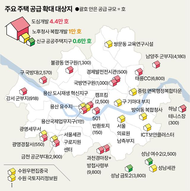 이번 발표는 수도권 외곽이나 신도시가 아닌 수도권 도심 위주 지역을 대상으로 하는데요(이미지). 서울에서는 용산국제업무지구 1만 3500호를 비롯해 용산 캠프킴 2500호, 노원구 군 골프장 태릉 부지 6800호, 은평구 일대 1300호, 금천구 독산 공군부대 2900호 등이 포함됐어요. 경기도에서는 과천 경마장·국군방첩사령부 부지에 9800호를 비롯해 판교 테크노밸리·성남시청 6300호, 남양주시 군부대 4200호, 고양시 국방대학교 2600호 등이 포함됐고요. 목표 착공 시점은 2027년~2030년 사이예요.