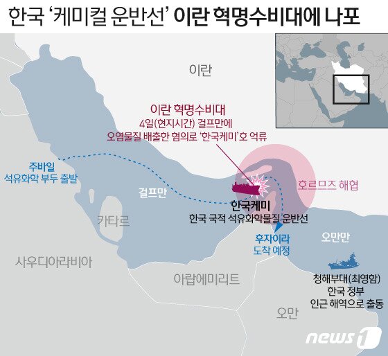 우리나라 국적의 선박이 이란 군대인 혁명수비대에게 붙잡혔어요. 붙잡힌 배는 ‘한국케미’라는 유조선으로, 우리 정부는 이란 근처 해협으로 군함을 급히 보냈습니다(지도).