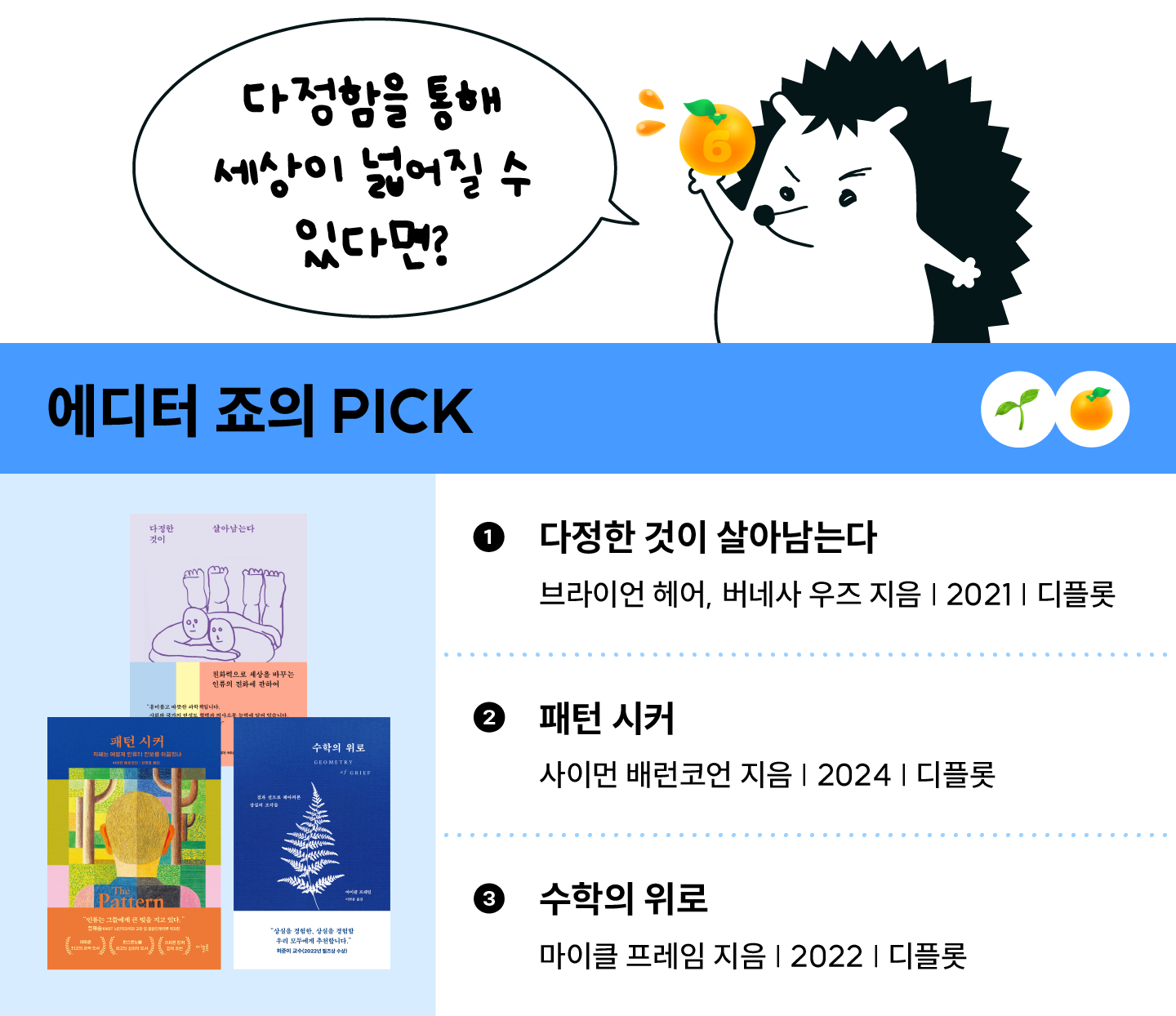 다정한 것이 살아남는다 🤝: 진화인류학자인 브라이언 헤어는 인류가 이렇게까지 발전할 수 있었던 건 다름 아닌 다정함 때문이라고 말해요. 더 많은 이들과 교류하고, 감정을 나누는 개체일수록 생존에 유리한 방향으로 진화해왔다는 것. 저자는 다정함이 세상을 진보시키는 힘이라고 말하며, 오늘날의 사회 문제들 역시 다정함을 통해 해결할 수 있다고 봐요.