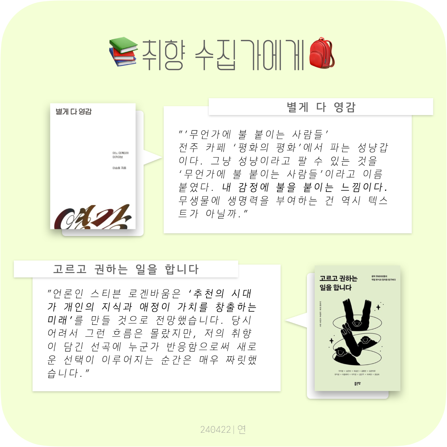 ๋๊ตฐ๊ฐ์๊ฒ ๋ฌด์์ ์ถ์ฒํ ์ ๋๊ฐ ๋๋ค๋ ๊ฒ, ์ด๊ฑธ ์ ์ผ๋ก ์ผ๋๋ค๋ ๊ฑด ๋ฌด์์ผ๊น?๐ง ๋ด ์๊ฐ์ ๊ทธ โ๋ฌด์โ์ ๋ํ ์ ์ ์ ๋ฌผ๋ก ์ด๊ณ , ์๋๋ฅผ ์ค๋ํ ๋งํ ๊ฝค ์๋ฆฌํ ๋๋ง์ ์ฃ๋๋ ํ์์ธ ๊ฒ ๊ฐ์. ์ฐ๋ฆฌ ์ฃผ๋ณ์ ๋์์์ด ๋ค๋ฆฌ๋ ์์ ์ด๋ผ๋ ์ฃผ์ ์ ๋ํด, โ๋จ์๊ฒ ์ถ์ฒํ ๋งํผ ์ทจํฅ์ด ๋๋ ทํ ์ฌ๋๋คโ์ ์ด์ผ๊ธฐ๋, ์์ ์ ๊ด์ฌ์ด ์๋ ์ฌ๋์๊ฒ๋ ๋งค๋ ฅ์ ์ธ ์ด์ผ๊ธฐ๊ฐ ๋ ๊ฑฐ์ผ๐ค๐ป