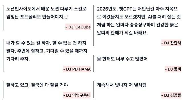 뉴스레터를 다 읽고, 구독자 구독이도 플레이리스트 페이지를 한 번 열어보세요. 여러분의 마음에 드는 노래를 찾아 선택해보시는 것도 좋고, 페이지를 즐겨찾기해두고 내일 밤 새해로 넘어가는 시간에 틀어보시는 것도 추천드려요. 자정 0시, 우리 함께 2026년을 맞이해요🌃