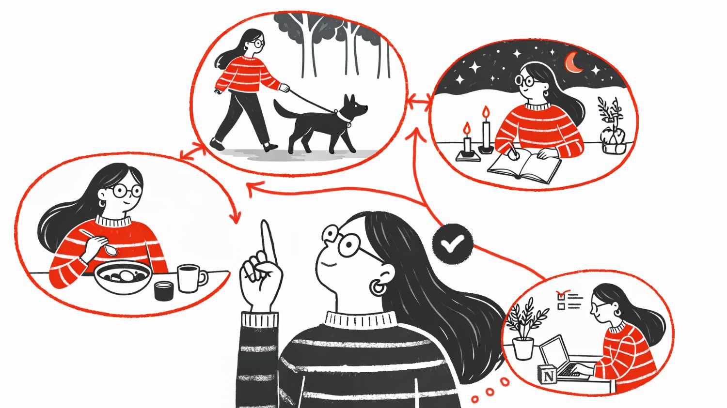 핵심은 주간 루틴 안에 메인 퀘스트를 자연스럽게 녹이는 거에요. ’매주 일요일 저녁 9시에 목표 점검하기’ 같은 별도 일정을 만들면, 그마저도 지키기 어렵습니다. 대신, 이미 하고 있는 루틴에 목표 확인을 끼워 넣어야 합니다. 예를 들어 매주 월요일 아침에 여는 노션 대시보드가 있다면, 그 화면에 메인 퀘스트가 자동으로 보이게 만드세요. 물을 마시러 부엌에 갈 때마다 비타민이 눈에 띄게 식탁에 놓아두는 것처럼, 노션을 열 때마다 목표가 자연스럽게 노출되어야 합니다. 이것이 바로 ’환경 설계’의 힘이죠.
