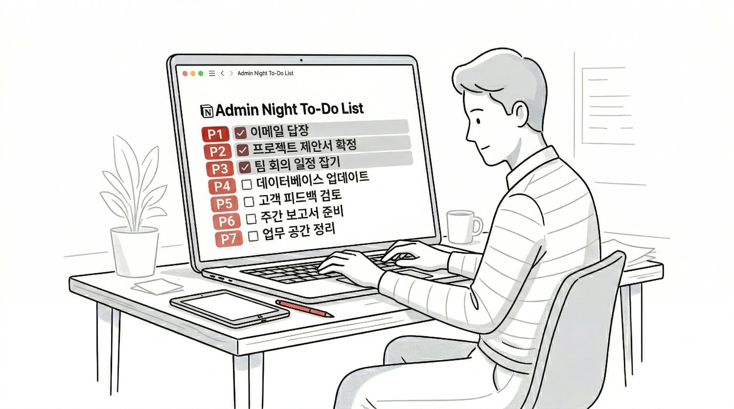 어드민 나이트 당일날, 투두리스트 앞에 앉으면 막막함이 밀려옵니다. 하루이틀 쌓인 게 아니라 최소 일주일에서 한 달 간 모았기 때문에 일단 개수가 많은 것도 한몫 하죠. “이 많은 걸 2시간 안에 다 할 수 있을까?” 날 잡고 하는 만큼 의욕은 넘치는데 어디서부터 손대야 할지 모르겠다는 생각이 듭니다. 그래서 처음 몇 분은 목록을 훑어보는 데 쓰고, 중간에 예상보다 오래 걸리는 일에 막혀 흐름이 끊기고, 제대로 마무리하지 못한 채 지쳐서 침대에 눕게 됩니다.