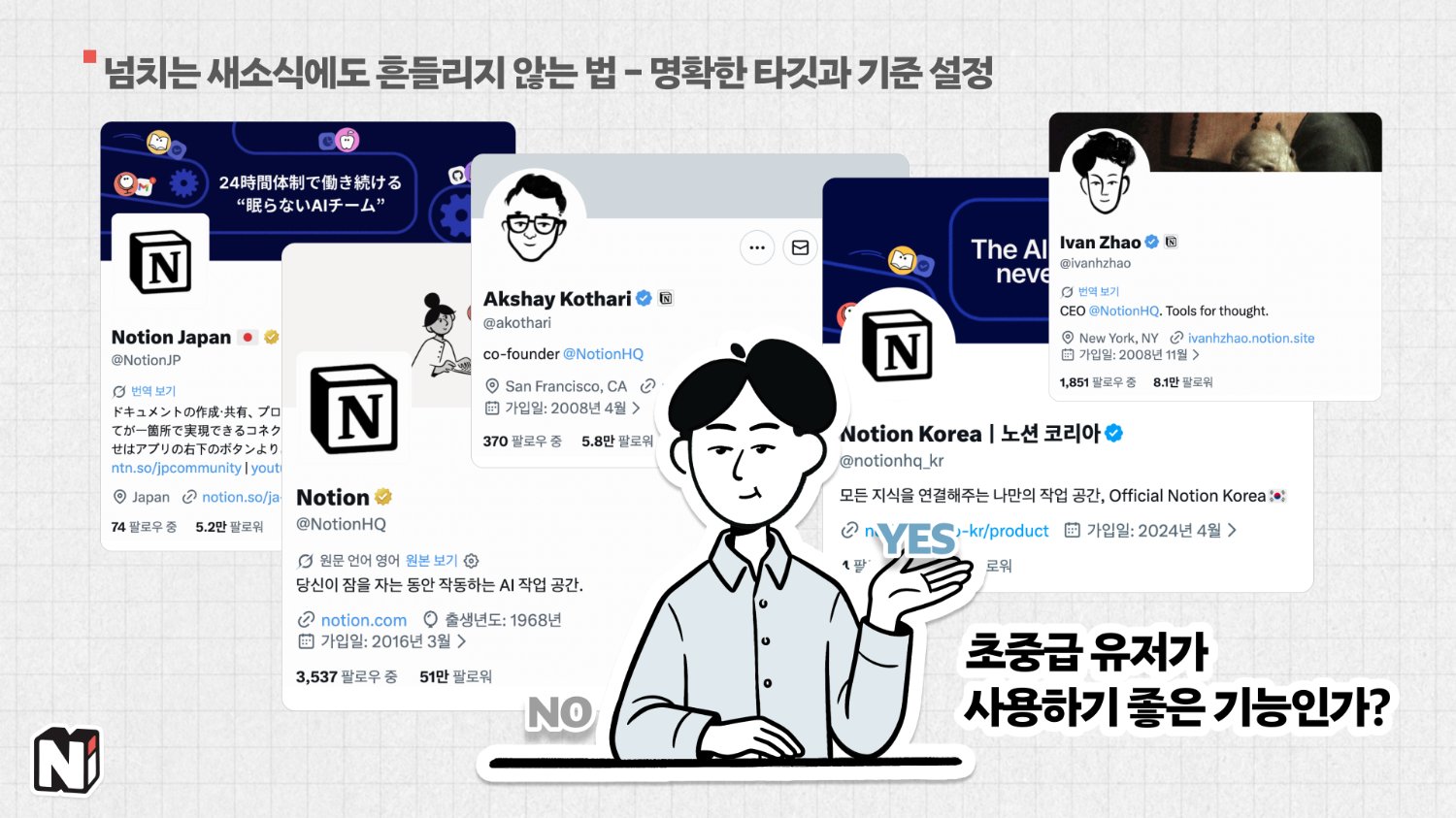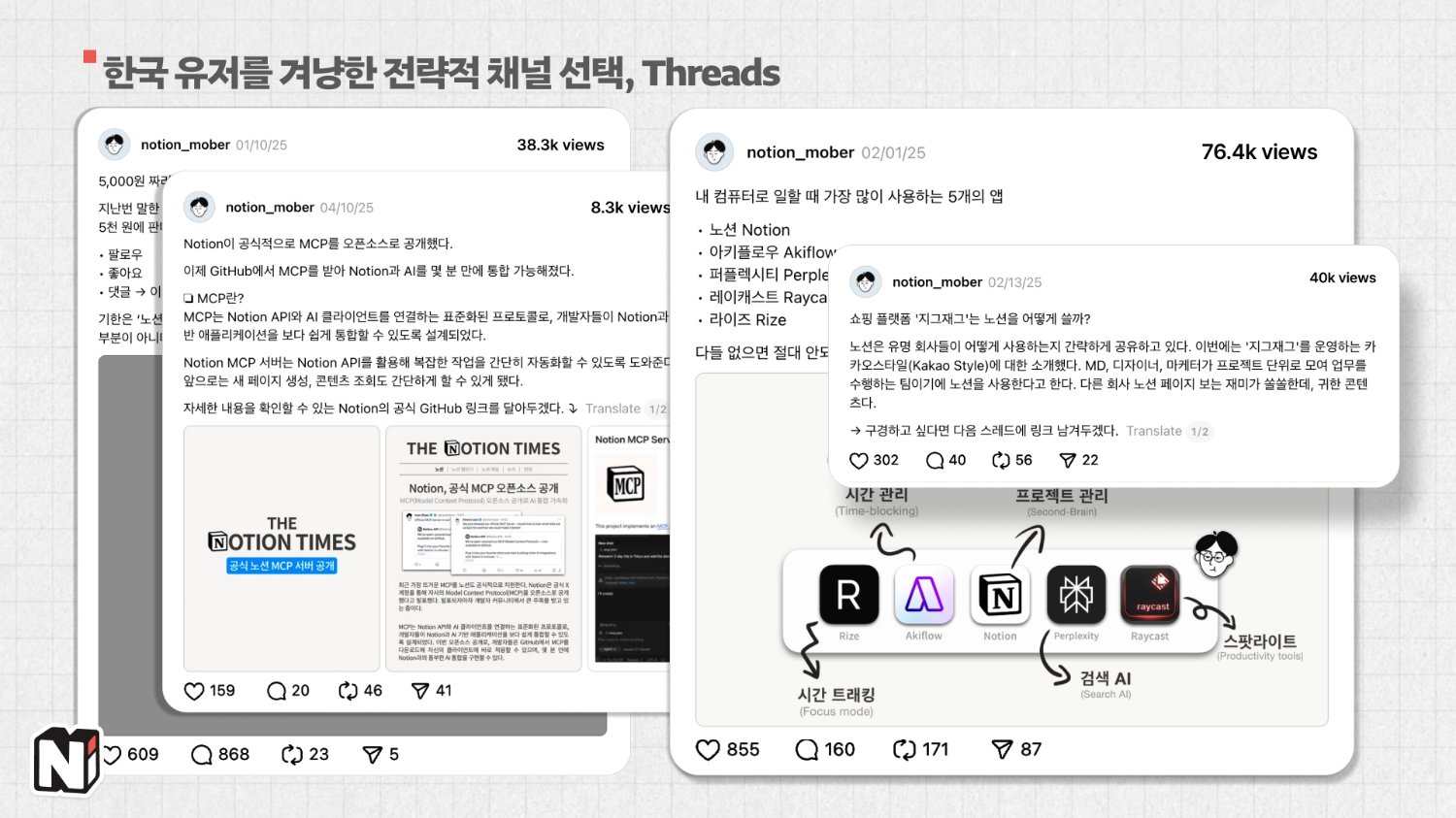 ๋ ธ์ ์๋ ๋ค์ํ ์นดํ ๊ณ ๋ฆฌ(๊ต์ก, ํ ํ๋ฆฟ ์ ์ ๋ฑ)๊ฐ ์์ ํ ๋ฐ ํด๋น ์นดํ ๊ณ ๋ฆฌ์์ '์ ๋ญ์ง?'๋ผ๋ ์ธ์์ ์ฃผ๋ฉด ๋๋ค๊ณ ์๊ฐํด์. ์ฆ, ๋์ ๋ ๋ณด์ ์ธ ํ๋ณด๋ฅผ ๋ณด์ฌ์ฃผ๋๊ฒ ํฌ์ธํธ๋ผ๊ณ ์๊ฐํฉ๋๋ค. ๋, ๋์ ํ๋์ ์ต๋ํ ๋ง์ด ๋ ธ์ถ์ํค๋ ๊ฒ์ ์ถ์ฒ๋๋ ค์. ์ ๋ ๋งค์ผ ์์นจ ์์์ ์ ๋ฌํ๋ฉด์ ๋ ธ์ ๊ณต์ ์ฑ๋๊ณผ ๋ ธ์ ์ฝ๋ฆฌ์ ๊ณต์ ์ฑ๋์ ํญ์ ํ๊ทธํด์. '์ด๊ฒ ๋ด~ ๋ ์ฌ๊ธฐ ์์ด!' ๋๋์ผ๋ก ๊ณ์ ์๋ ค์คฌ๋ฌ๊น์?๐