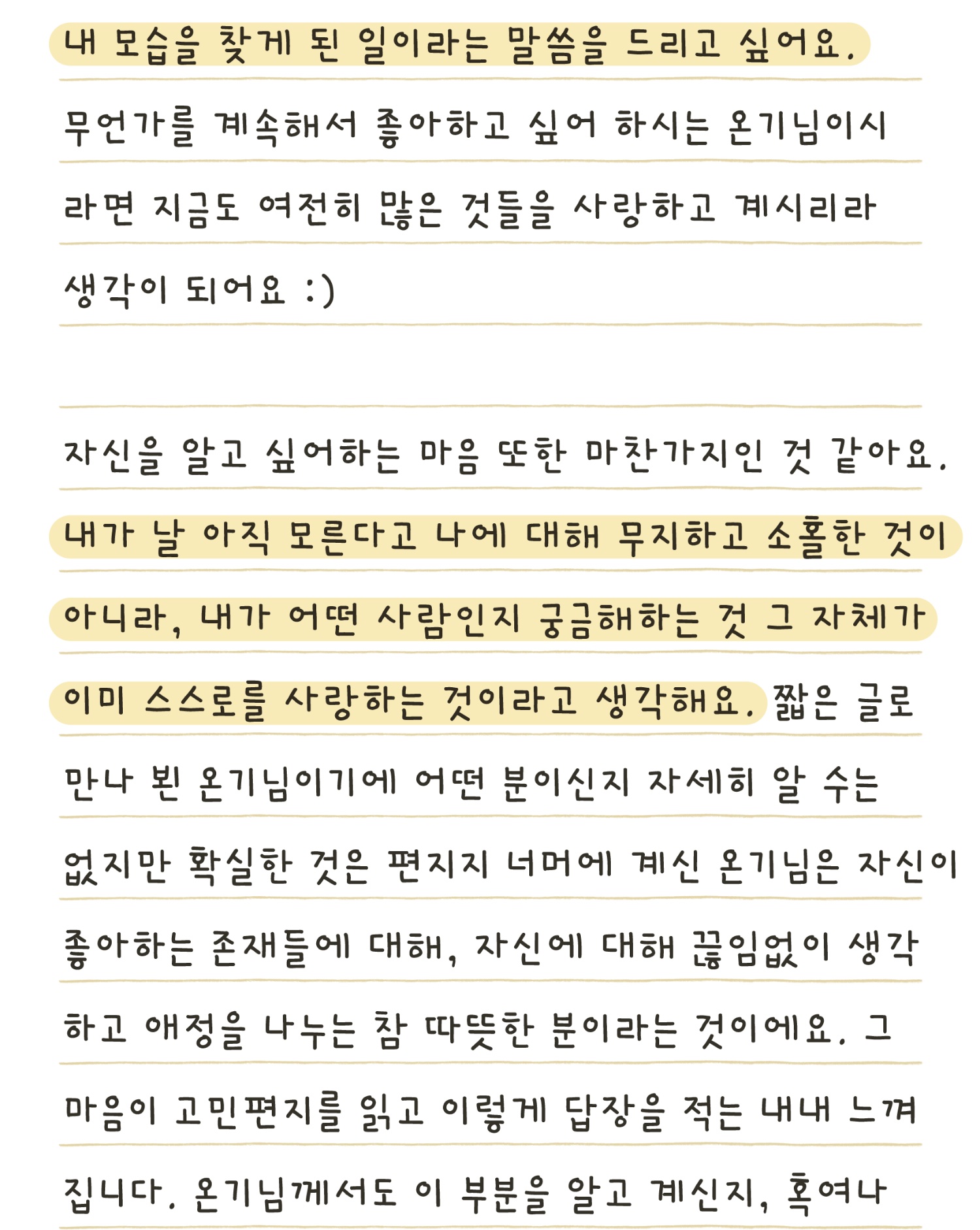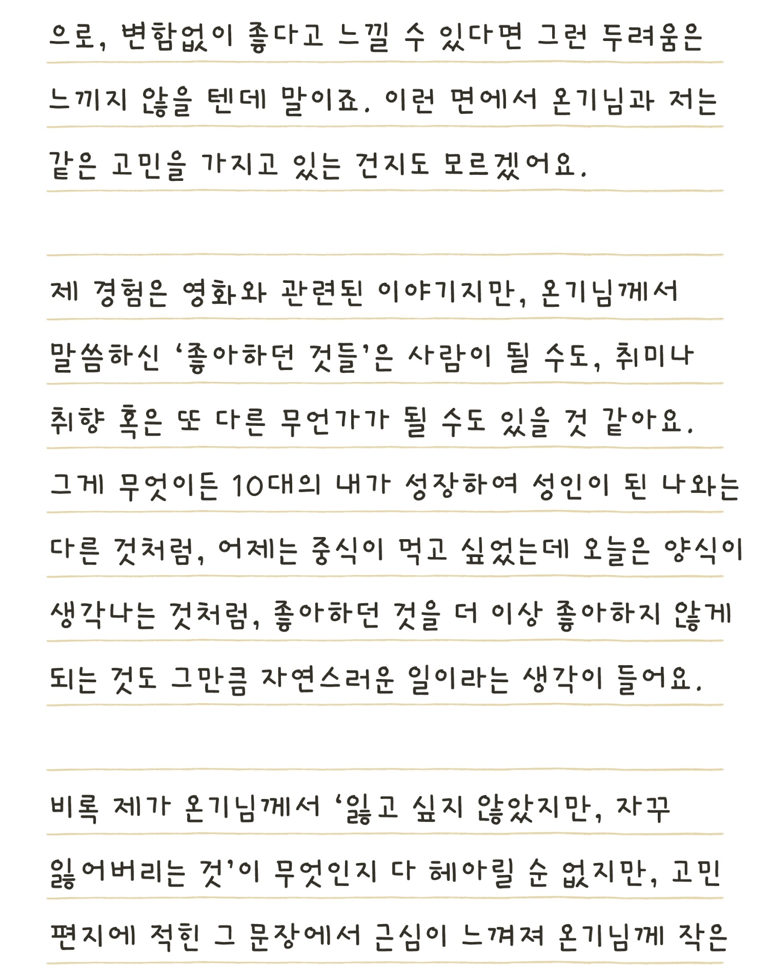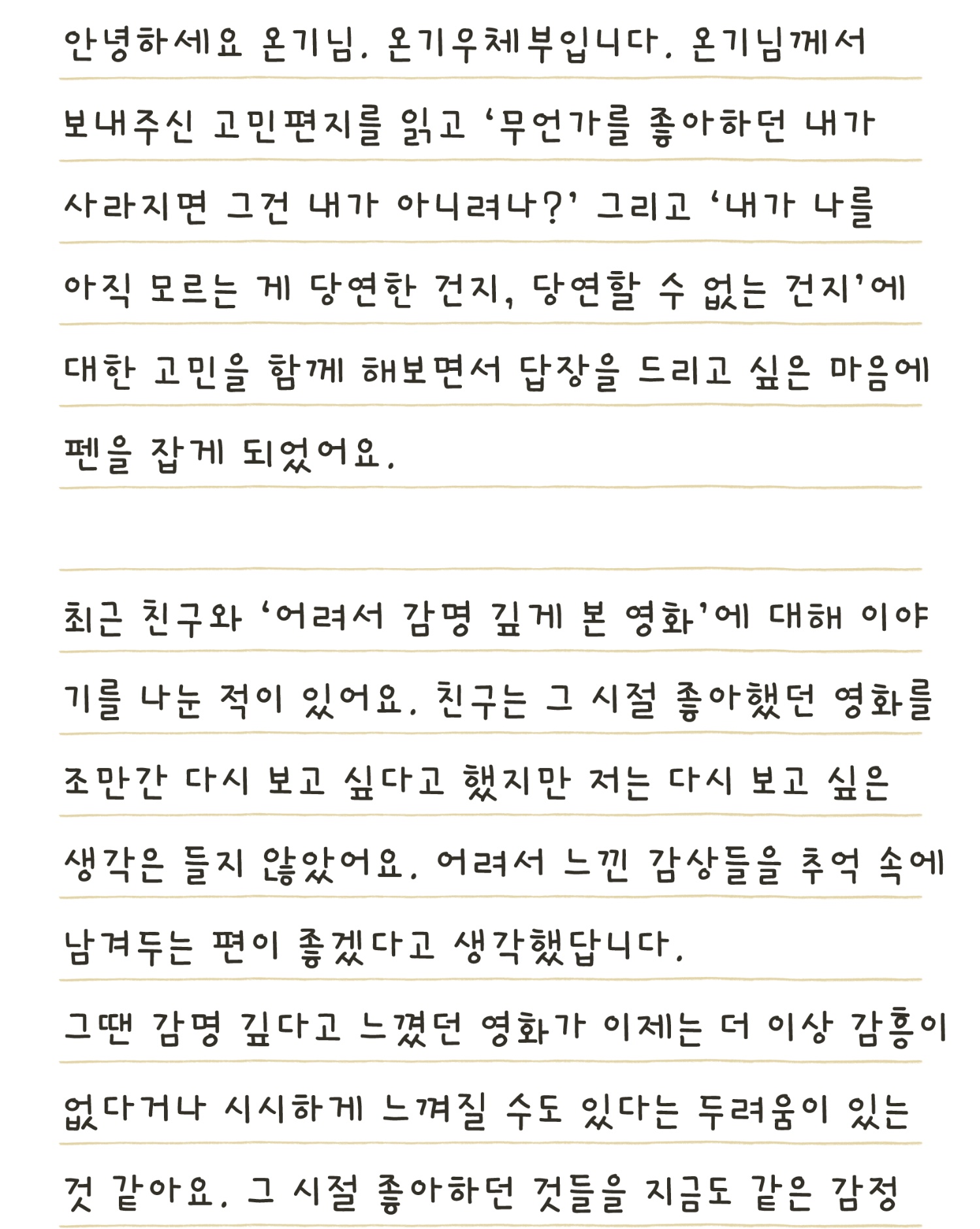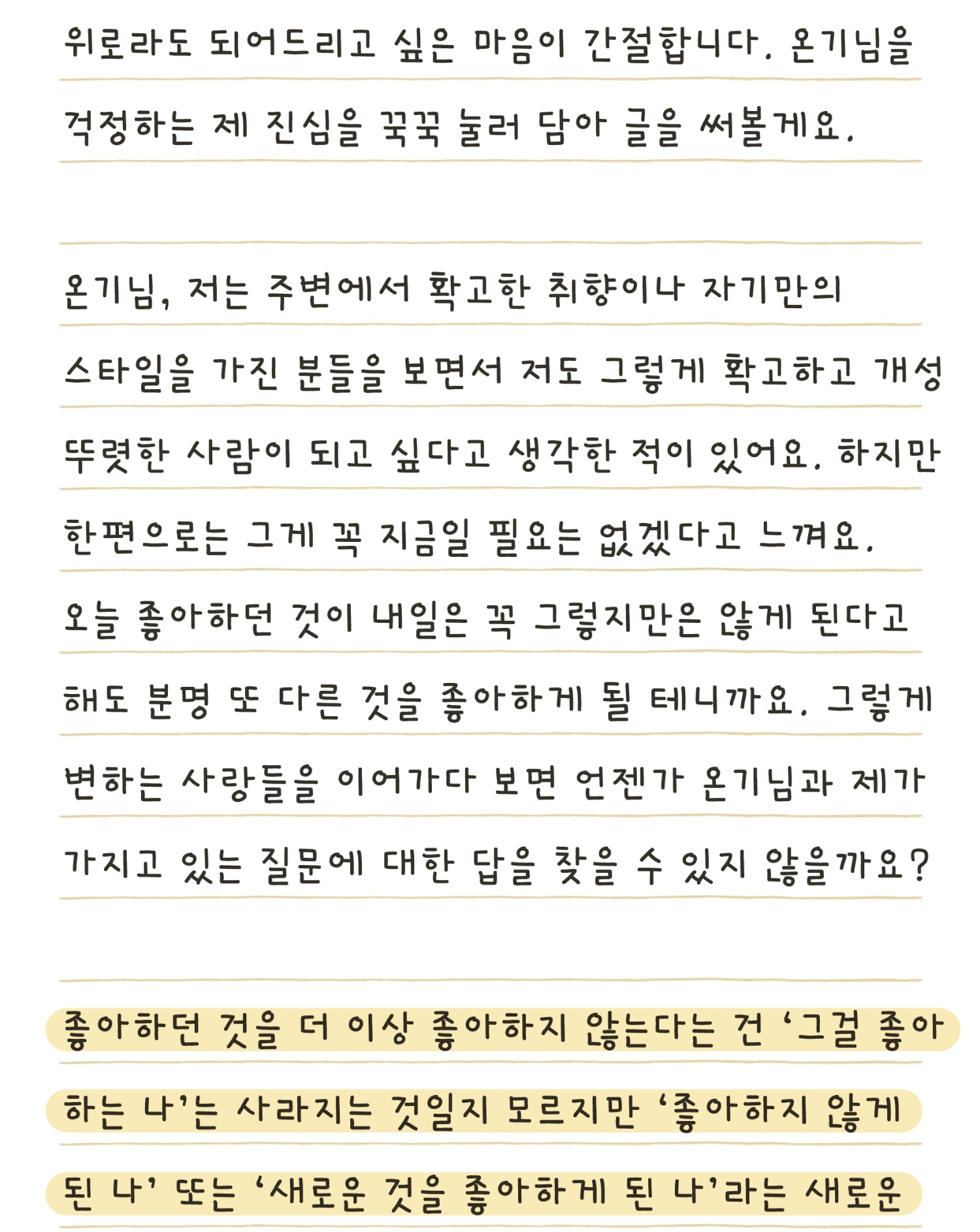 안녕하세요, 이런 편지는 처음이라 조금 떨리네요. 제 고민은 좋아하던 것들을 잃어버리는 것에 대한 두려움입니다.