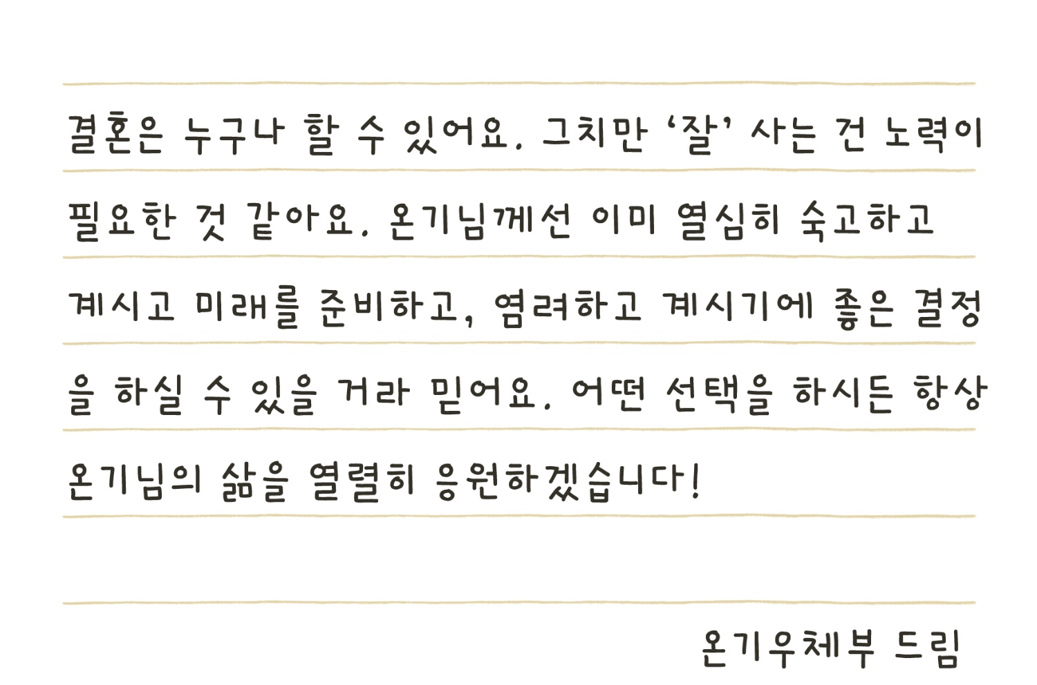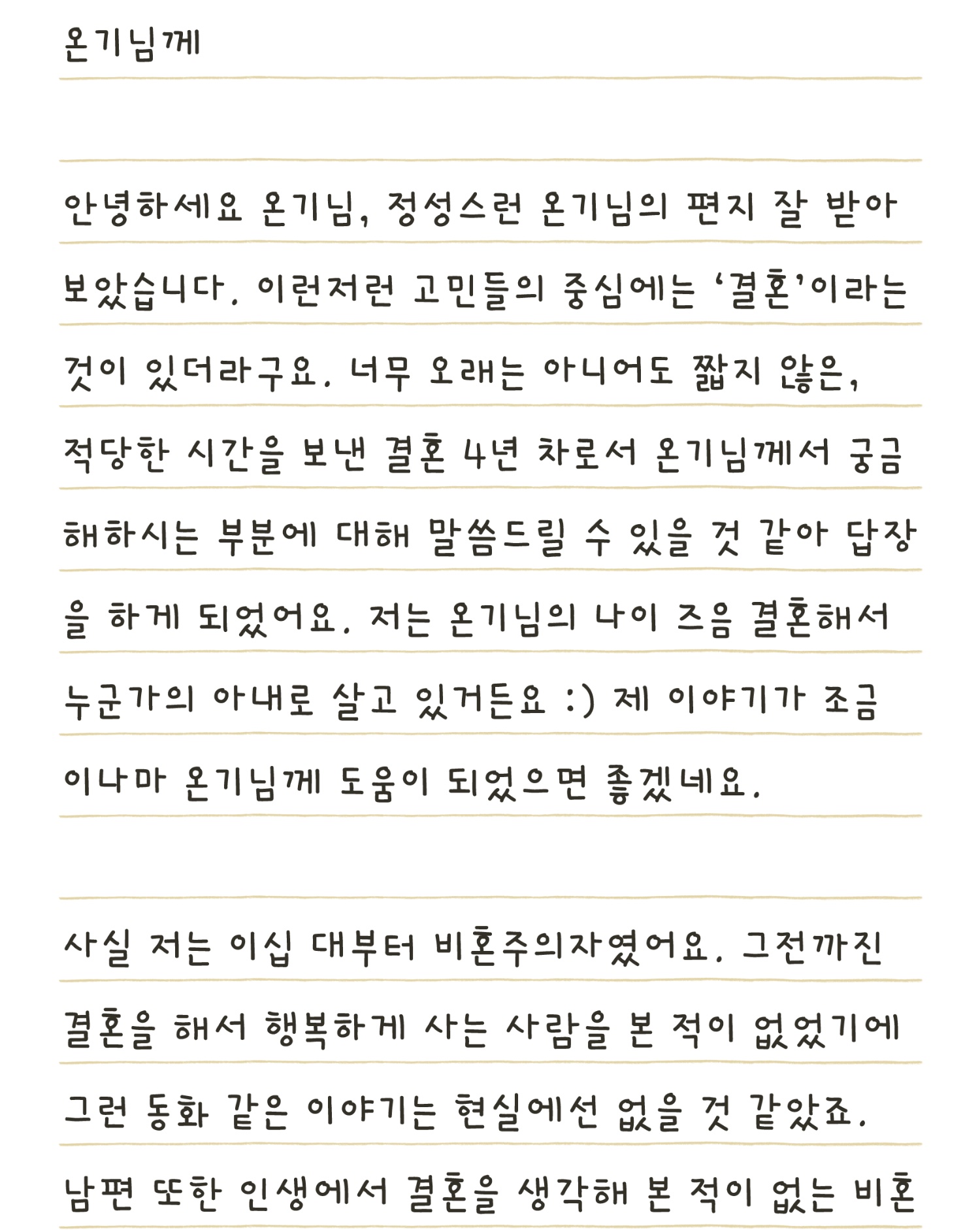 결혼은 무엇일까요... 저도 가정을 꾸리고는 싶지만, 평생을 한 사람과 살아가는 것이 정말 가능한지 제 자신이 의심될 때가 있어요. 갈팡질팡하게 되네요.