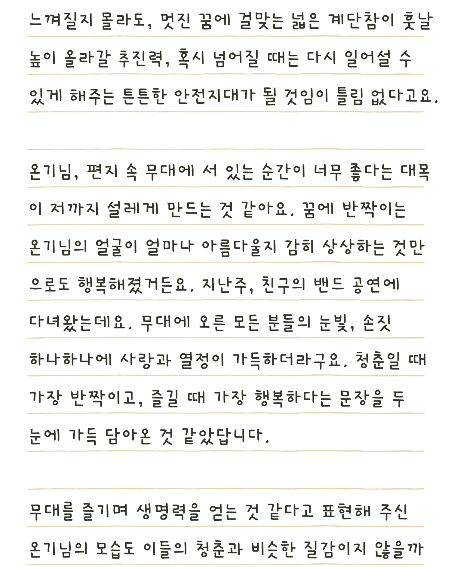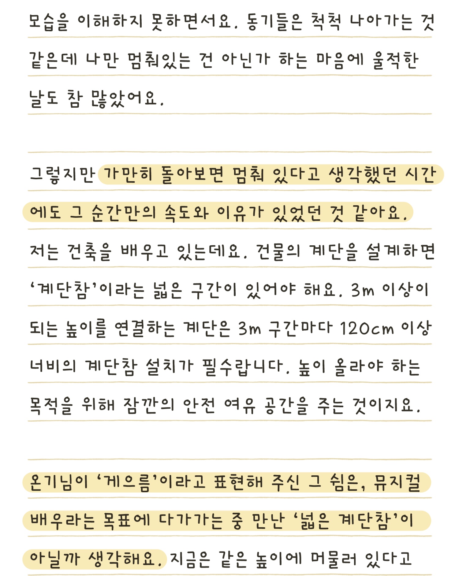 그리고 동기들이 하루가 다르게 성장하는 모습을 보며 자꾸만 조바심이 납니다. 꿈에 조금씩 가까워질수록 이 길이 얼마나 쉽지 않은지 더 실감하게 되는 것 같아요.