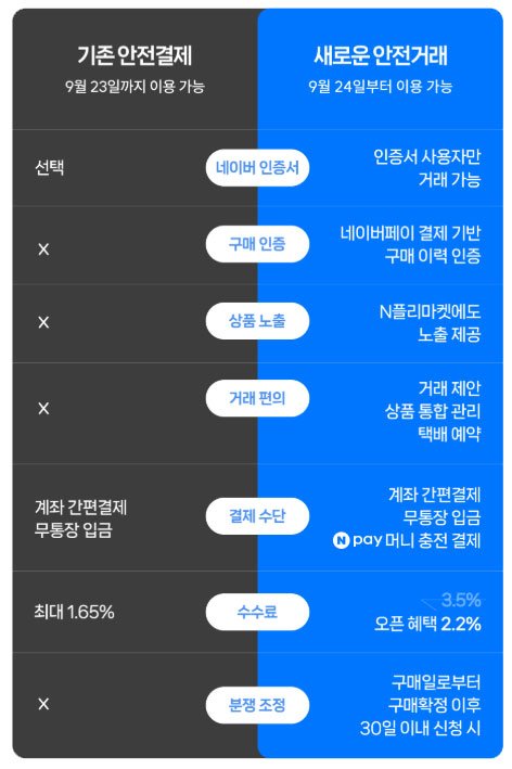 네이버 카페는 9월 24일부터 중고를 안전하게 거래할 수 있도록 ‘새로운 안전거래’ 솔루션을 도입해요. 중고거래에서 반드시 필요한 안전성과 편의성을 높이면서 낮은 수수료로 이용자를 끌어들이고, 참여율을 올리겠다는 게 핵심이죠.
