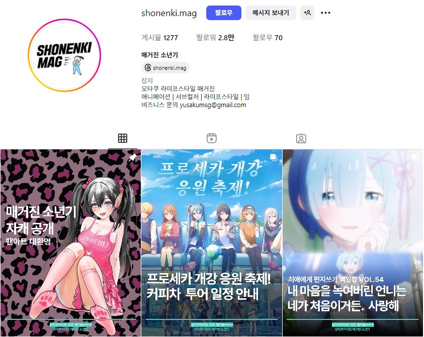 오타쿠 라이프스타일 매거진 ‘소년기’ 인스타그램 계정도 있더라고요. 애니메이션, 서브컬처와 관련한 콘텐츠를 꾸준하게 업로드하면서 팬들을 모으고 있죠.