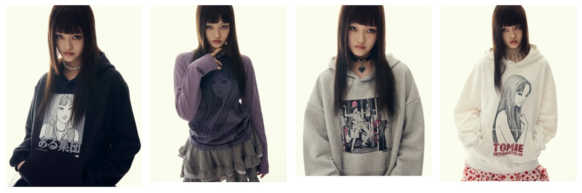 특히 패션계에서는 애니메이션, 만화 감성이 과감하게 드러난 아이템들이 많이 보여요. 캐릭터를 그래픽으로 크게 그려 넣고, 이와 어울리게 짧은 치마를 매치하거나, 스트릿한 스타일을 입기도 하죠. 나이트고스트클럽은 원래도 만화 느낌의 그래픽을 잘 활용하는 브랜드인데, 올해 이토 준지 매니악과 콜라보하기도 했어요.