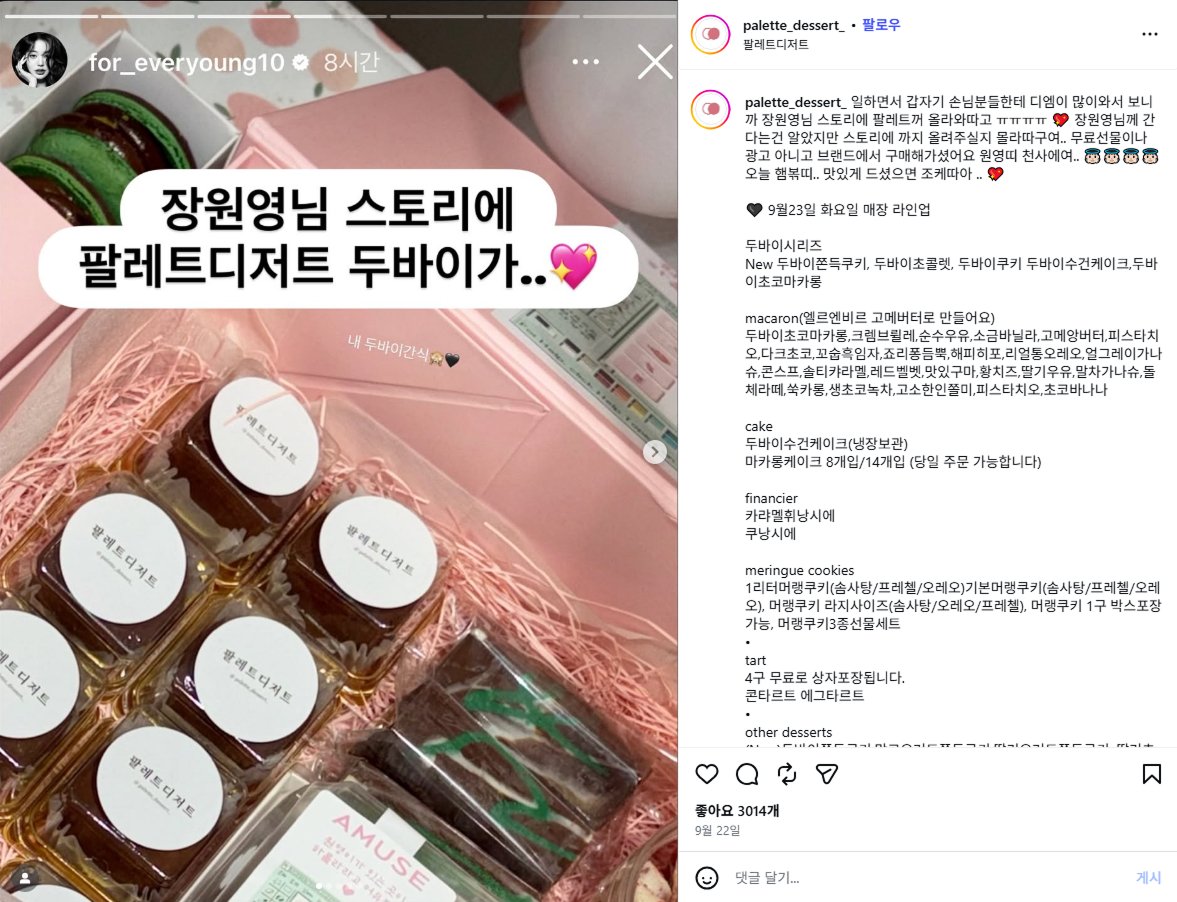 이번 두쫀쿠의 유행은 아이브의 멤버 ‘장원영’으로 알려져 있어요. 두바이 초콜릿 애호가로 알려진 장원영이 인스타그램에 두쫀쿠 사진을 올렸거든요. 장원영이 직접 구매한 것으로 알려진 브랜드 ‘팔레트 디저트’는 지금 오픈런, 웨이팅 성지가 됐어요.