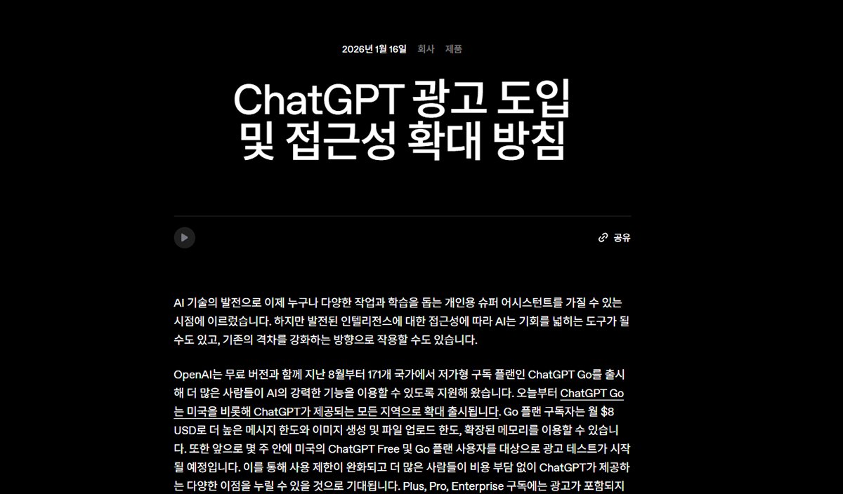 오픈AI가 공식적으로 챗GPT에 광고를 넣어요. 미국에서 먼저 테스트할 예정으로, 무료 버전(성인 사용자)과 ‘챗GPT Go’ 이용자가 대상입니다.