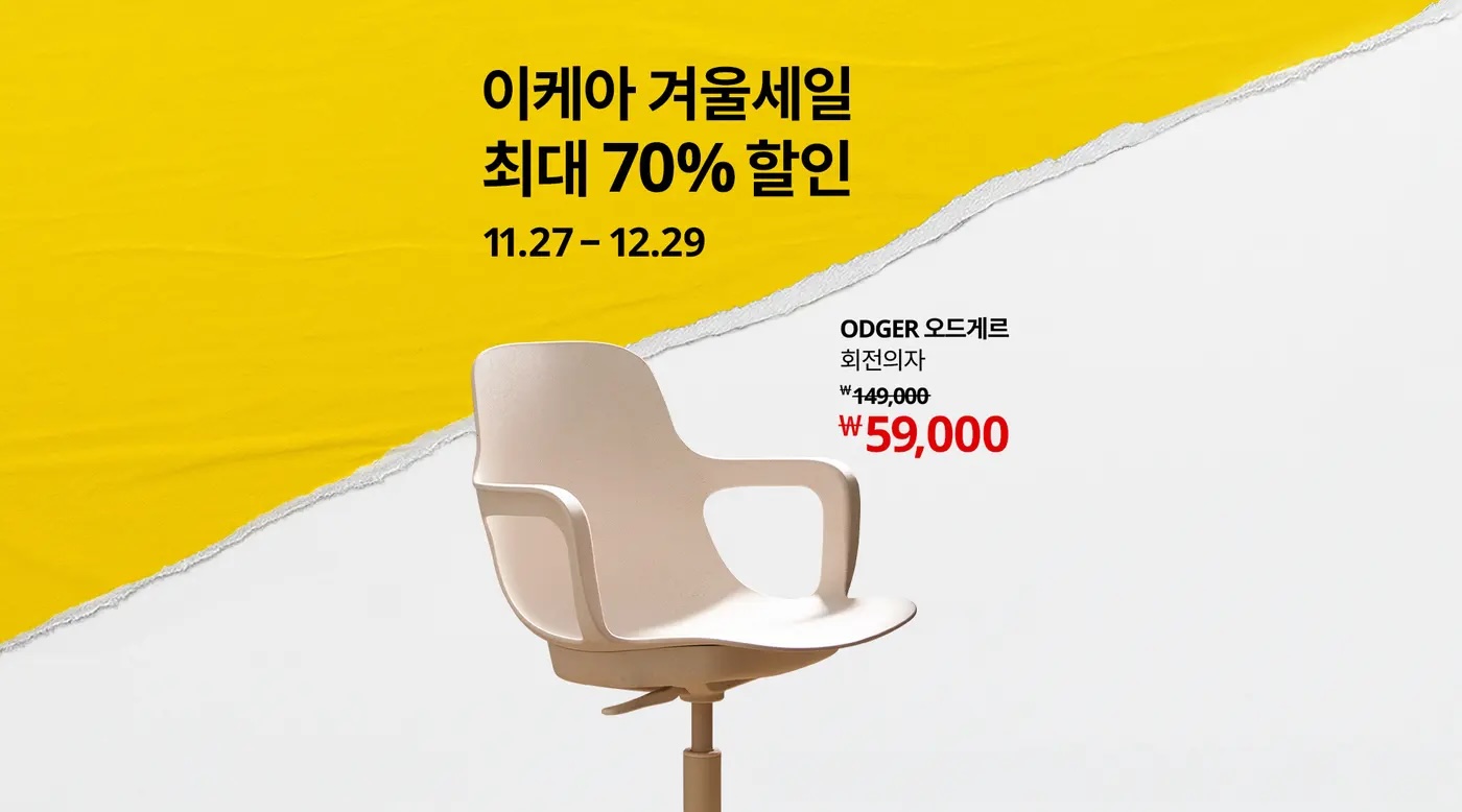 🪑 이케아가 오는 29일(월)까지 겨울 세일 행사를 열고 최대 70% 할인 + 주차별 10% 추가 할인 혜택을 제공해요. 오는 6일(토)까지는 회전의자 등 홈 오피스 인기 품목을 추가 할인해요.