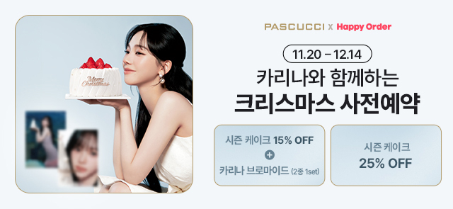 🎂 파스쿠찌가 오는 14일(일)까지 크리스마스 케이크 사전예약을 진행하고 15% 할인 + 카리나 브로마이드 2종, 또는 25% 할인 혜택을 제공해요.
