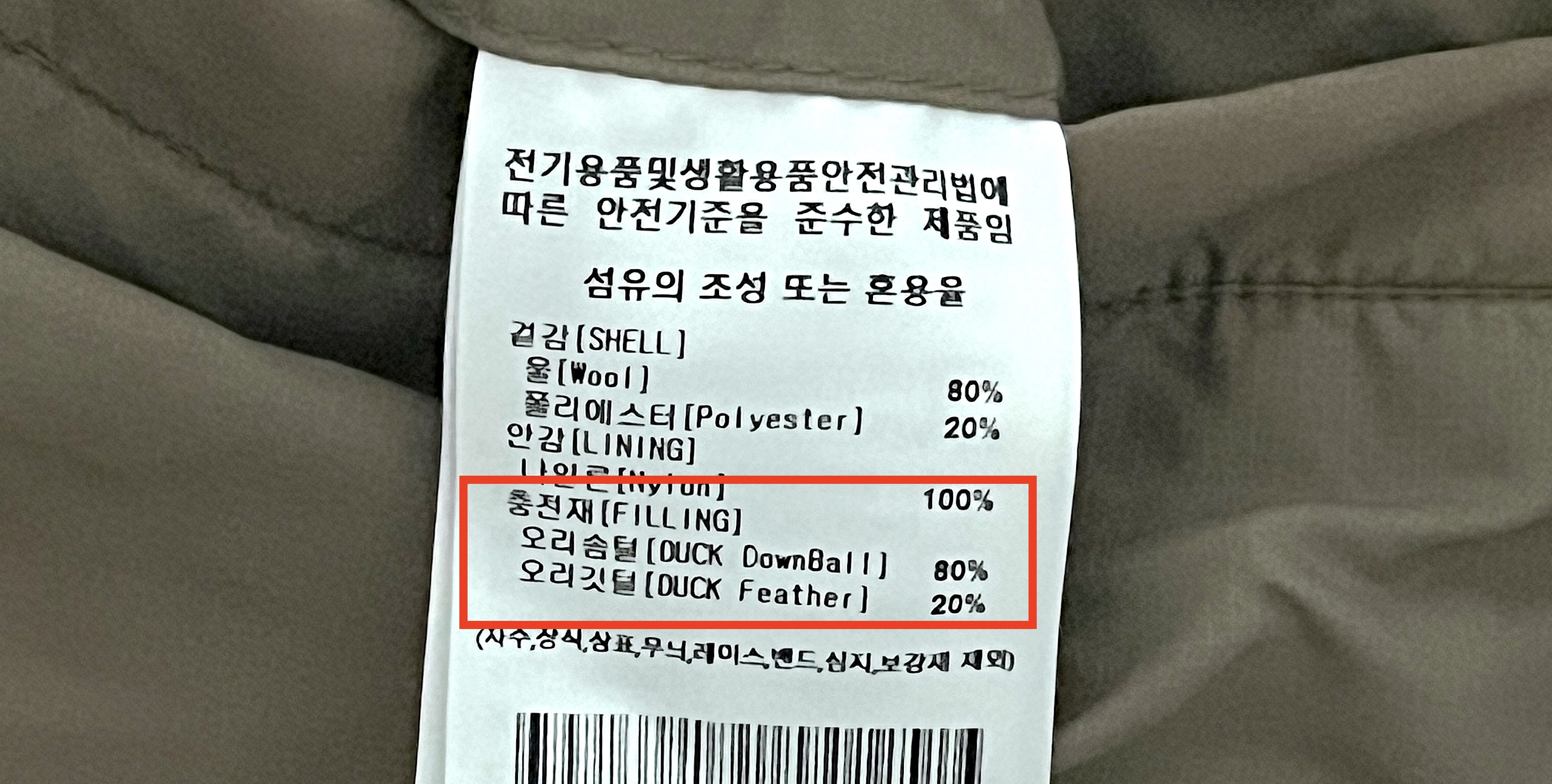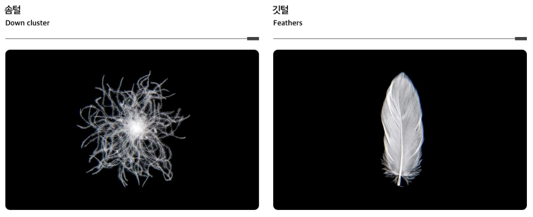 하지만 종류보다 더 중요한 게 하나 있어요. 바로 솜털과 깃털의 비율이에요. 패딩 안에는 부드러운 솜털만 들어가는 게 아니라, 좀 더 단단한 깃털이 섞여 들어가요. 깃털은 촘촘하게 공기를 붙잡기보다는 형태를 잡아주는 역할에 가깝기 때문에, 보온성 측면에서는 솜털이 훨씬 중요해요. 그래서 라벨에 적힌 ‘솜털 80% / 깃털 20%’와 같은 표기를 눈여겨볼 필요가 있어요. 솜털 비율이 70% 이상이면 일상용으로는 충분히 따뜻한 편이고, 솜털과 깃털의 비율이 90:10 정도면 한겨울에도 따뜻해요.