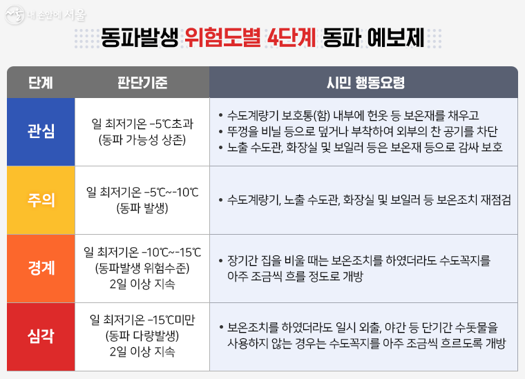 기온에 따라 행동 계획을 세울 수 있는 공식 가이드라인이 있으니 참고하면 좋아요. 서울시가 매년 시행하는 동파 예보제에 따르면 일 최저기온에 따라 ‘관심 → 주의 → 경계 → 심각’ 4단계로 나뉘고, 해야 할 행동이 정해져 있어요: