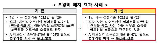 부양비 폐지는 이재명 정부의 핵심 국정과제이자 부양의무자 관련 제도 중 하나로, 부양능력이 미약한 가족의 소득 일부를 '간주 부양비'로 계산해 수급자의 소득으로 반영하던 방식이에요. 실제로는 아무 지원도 받지 않아도 소득이 있다고 간주되면서 저소득층이 수급대상에서 제외되는 불합리함이 반복돼 왔는데요. 예를 들어 실제 소득이 67만 원임에도 연락이 끊긴 가족의 소득 일부(36만 원)가 소득으로 간주돼 소득인정액이 103만 원으로 계산되면서 수급 대상에서 탈락할 수 있는 것. 그러나 부양비가 폐지되면 실제 소득만 반영돼 기준 이하가 돼 수급자 선정이 가능해져요.