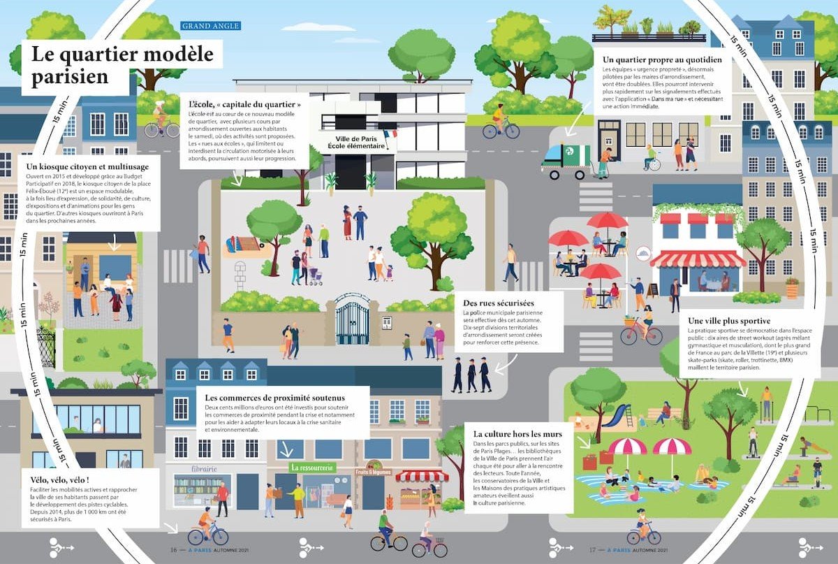 15๋ถ ๋์: ๋์ ๋ด ์ด๋ ์ง์ ์์๋ ์ํ์ ํ์ํ ์ฌ์ฏ ๊ฐ์ง์ ์ฌํ์ ๊ธฐ๋ฅ(์ฃผ๊ฑฐ, ์ผ์๋ฆฌ, ์๋ฃ ์ ๊ทผ์ฑ, ๋ฌผํ ๋ฐ ์ฌํ, ํ์ต, ์ฑ์ทจ(์คํฌ์ธ , ์ฌ๊ฐ ๋ฑ))์ด ์งํฉ๋ ๋์๋ก ํ๋์ค์ ํ์ ์นด๋ฅผ๋ก์ค ๋ชจ๋ ๋ ธ๊ฐ ์ฐฝ์ํ ๊ฐ๋