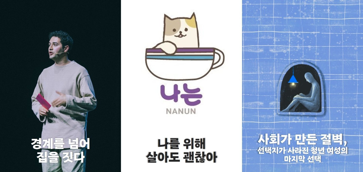 ์ฌํด ๊ตฌ๋ ์ ์ฌ๋ฌ๋ถ์ด ๊ฐ์ฅ ๋ง์ด ์ด์ด๋ณด์ ๋ ํฐ๋ ๋ฌด์์ด์์๊น์? ์ฒซ ๋ฒ์งธ๋ ์๋ฆฌ์ ๋๋ฏผ์์ ์ ์ฃผ๋์์ ์๋ก์ด ์ถ์ ์ผ๊ตฐ ํ๋๊ฐ์ ์ด์ผ๊ธฐ๋ฅผ ๋ด์ "๊ฒฝ๊ณ๋ฅผ ๋์ด ์ง์ ์ง๋ค"์์ต๋๋ค. ๊ตญ๊ฒฝ๊ณผ ์ธ์ด, ๋ฌธํ์ ๊ฒฝ๊ณ๋ฅผ ๋์ด ํ๊ตญ์ธ์ผ๋ก ์ด์๊ฐ๊ธฐ๋ก ์ ํํ ํ ์ฌ๋์ ์ฉ๊ธฐ ์๋ ์ฌ์ ์ด ๋ง์ ๋ถ๋ค์ ๋ง์์ ๋ฟ์๋ ๊ฒ ๊ฐ์์. ๋ ๋ฒ์งธ๋ก ๋์ ์คํ์จ์ ๊ธฐ๋กํ ๋ ํฐ๋ ์ฅ์ ๋ฅผ ๊ฐ์ง ํ์ ์๋งค๋ฅผ ๋ ๋น์ฅ์ ํ์ ๋ค์ ์์กฐ๋ชจ์ ์ด์ผ๊ธฐ์ธ "๋๋ฅผ ์ํด ์ด์๋ ๊ด์ฐฎ์"์์ด์. ๊ฐ์กฑ ์์์ '์ฐฉํ ์์ด'๋ก ์ด์์จ ์ด๋ค์ด ์์ ์ ์ถ์ ๋์ฐพ์๊ฐ๋ ๊ณผ์ ์ ๋ง์ ๋ ์๋ถ๋ค๊ป ๊ณต๊ฐ์ ๋ถ๋ฌ์ผ์ผ์ผฐ์ฃ . ์ธ ๋ฒ์งธ๋ ์ฒญ๋ ์ฌ์ฑ์ ์์ด ๋ฌธ์ ๋ฅผ ๊ตฌ์กฐ์ ๊ด์ ์์ ๋ถ์ํ ๊ธฐ๊ณ ๋ฌธ "์ฌํ๊ฐ ๋ง๋ ์ ๋ฒฝ, ์ ํ์ง๊ฐ ์ฌ๋ผ์ง ์ฒญ๋ ์ฌ์ฑ์ ๋ง์ง๋ง ์ ํ"์ด์์ต๋๋ค. ๊ฐ์ธ์ ๋์ฝํจ์ด ์๋ ์ฌํ๊ตฌ์กฐ์ ๋ฌธ์ ๋ก ๋ฐ๋ผ๋ณธ ๋ ์นด๋ก์ด ์๊ฐ์ด ๋ ์ ์ฌ๋ฌ๋ถ์ ์์ ์ ์ฌ๋ก์ก์์ด์.