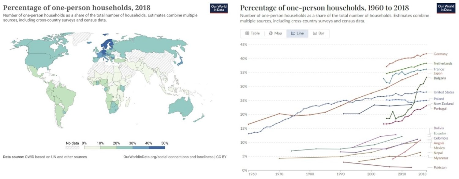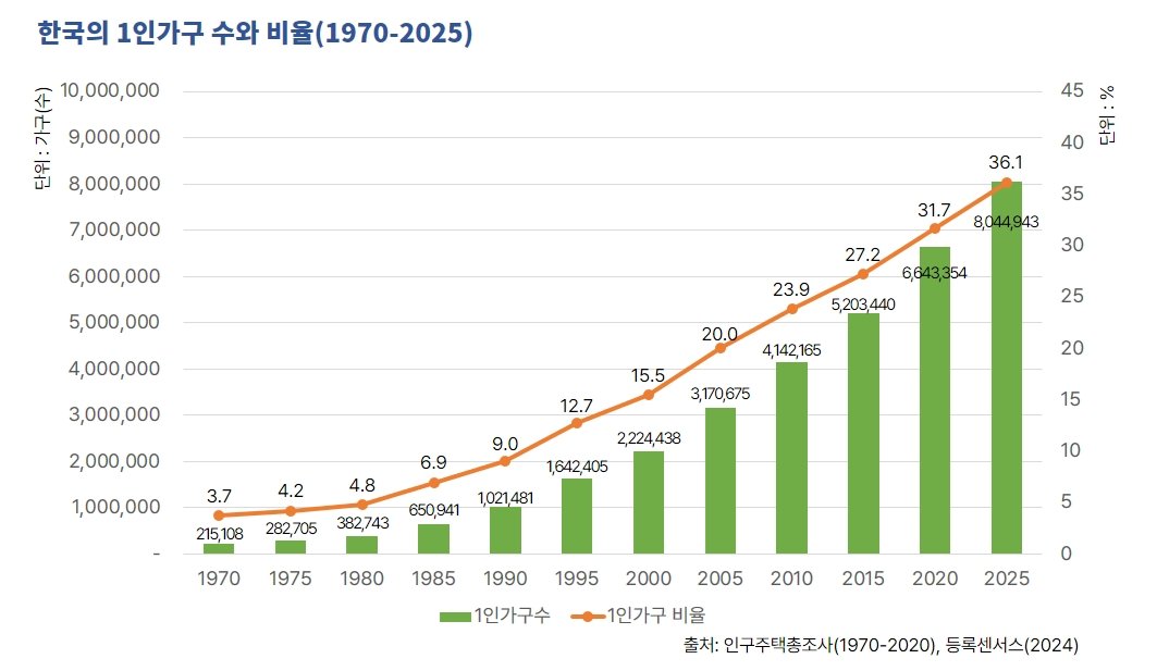 반대로 경제적으로 풍요롭고 정치적으로 안정된 후기 자본주의 국가들― 유럽, 북미, 일본, 한국―들에서 1인가구 비율이 40%를 넘나든다. 우리나라도 지금보다 훨씬 경제적으로 어렵고 정치적으로 혼란스러웠을 때 오히려 혼자 사는 사람들의 비율이 낮았다. 1970년대 1인가구는 전체 가구의 3%대에 불과했다.