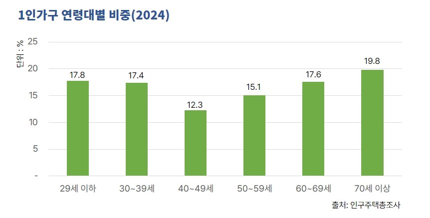 이때 1인가구가 경험하는 감정은 외로움이다. 2025년 국가데이터처 통계에 따르면, 비혼자(48.9%)가 기혼자(38.2%)보다 평소 외로움을 느낄 확률이 10%p 높다. 문제는 이러한 외로움이 누적되면서 발생하는 정신건강의 악화다. 미국의 공중보건위생국장을 지낸 비벡 머시는 외로움은 하루 담배 15개비를 피는 것만큼 건강에 해롭다고 말한다. 실제로 혼자 사는 사람들은 우울증에 걸릴 확률이 기혼자보다 2배 이상, 자살생각이나 시도를 할 확률은 4배 이상 높다.