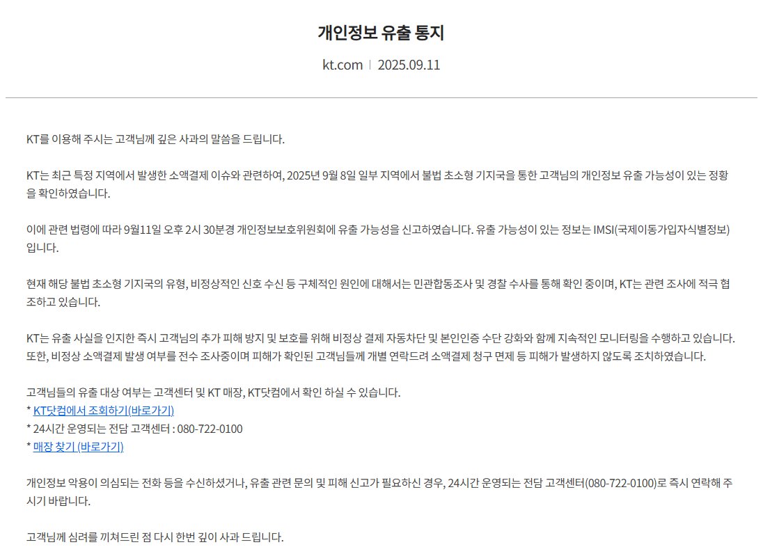 사건 초기 KT는 개인정보 유출 정황이 없다고 주장했지만, 9월 11일 기자간담회에서 IMSI 유출 사실을 인정하며 입장을 번복했습니다. 이 과정에서 피해 사실을 축소하려 한 것 아니냐는 의혹을 불렀습니다.