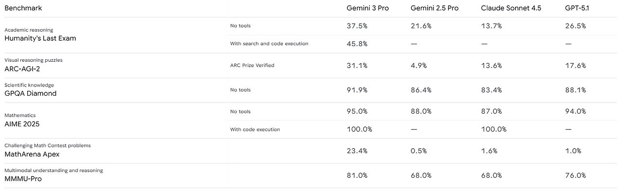 Gemini 3 Pro Benchmark (출처 : deepmind)