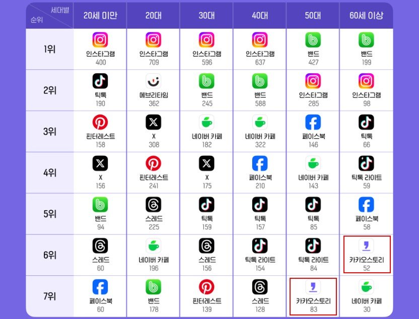 5060 세대에서만 사용되고 있는 카카오스토리 (출처 : WISEAPP·RETAIL)