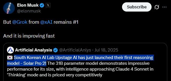 업스테이지의 기술력은 글로벌 무대에서 검증됐습니다. 지난해 자체 개발한 거대언어모델(LLM) '솔라 프로 2(Solar Pro 2)'가 글로벌 AI 벤치마크에서 12위를 기록한 것인데요. 일론 머스크는 이 소식을 접하고 X(구 트위터)에 "그러나 여전히 xAI가 1등"이라며 직접 반응하기도 했습니다.