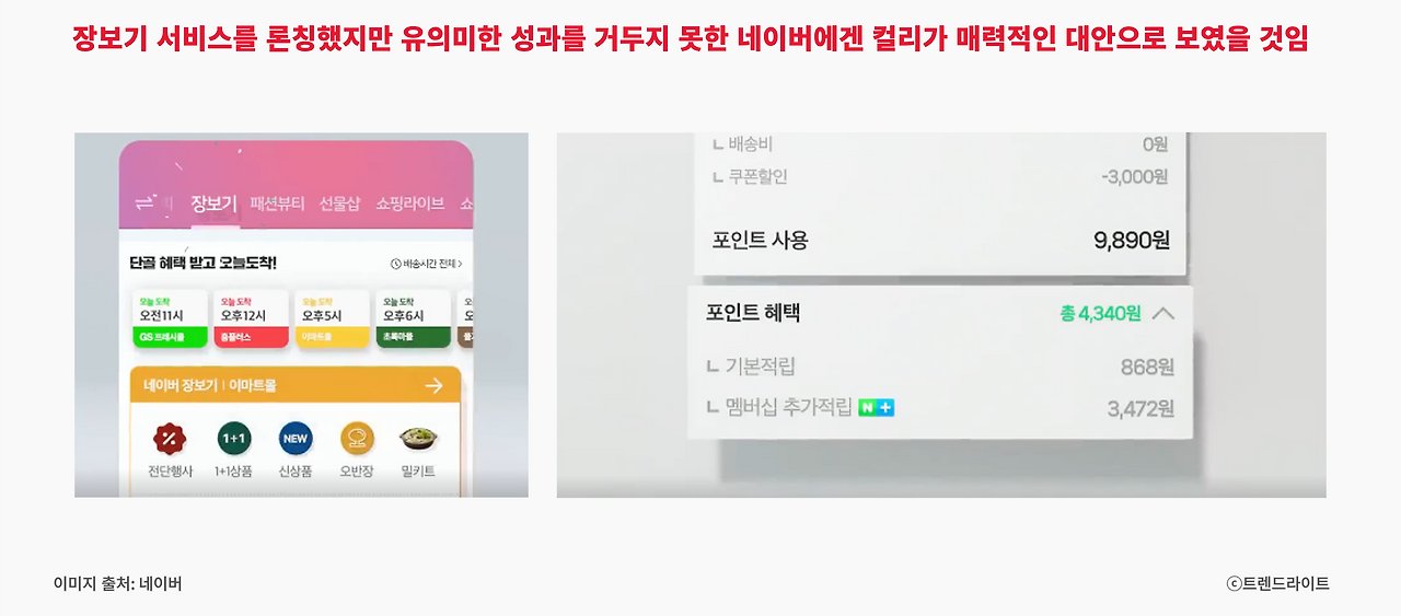 네이버는 오래전부터 장보기 시장에 진출하려 했지만, 자리 잡지 못하고 있기에 컬리가 더욱 탐났을 겁니