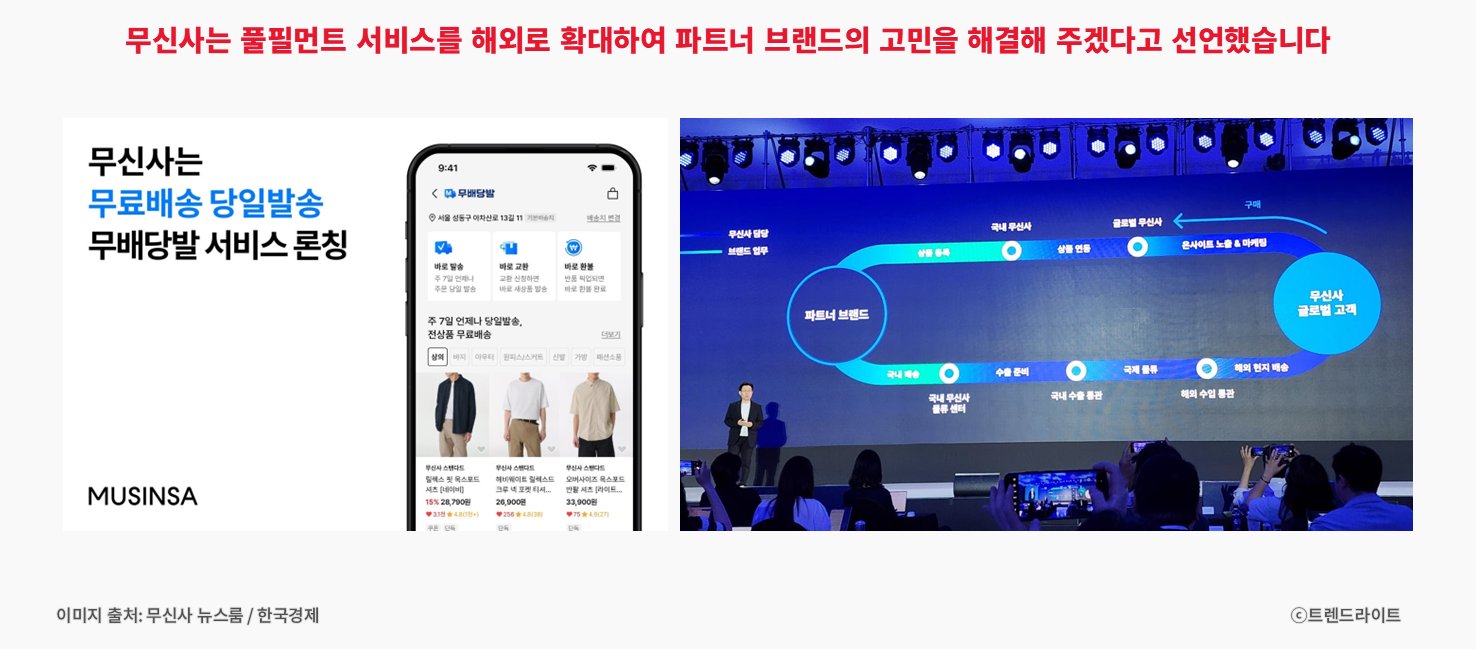 하지만 여기서 한 가지 의문이 생길 수 있습니다. 어차피 현지 파트너를 활용할 거라면, 굳이 무신사를 통해 진출할 필요가 있을까요? 특히 일정 규모 이상의 브랜드라면 직접 현지 플랫폼과 손잡는 게 더 효율적일 수 있습니다. 작은 브랜드는 무신사를 통해 진출하는 것이 합리적이지만, 어느 정도 성장한 브랜드는 상황이 다를 수 있죠. 그래서 무신사가 내세운 차별점이 바로 ‘물류’입니다.