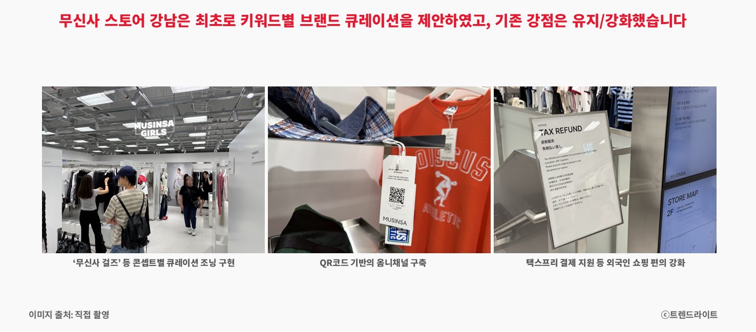 대신 눈에 띈 건 “옷이 진짜 예쁘다”는 감탄, 옷을 직접 대보며 고르는 즐거움, 피팅룸 앞에 길게 늘어선 줄이었습니다. 그야말로 ‘잘 되는 오프라인 의류 매장’의 전형적인 풍경이었죠. 오픈 소식을 모르고 지나가다 무신사 로고를 보고 들어오는 고객도 적지 않았고요. 이 모든 유입의 원천은 결국 브랜드와 상품이었습니다.