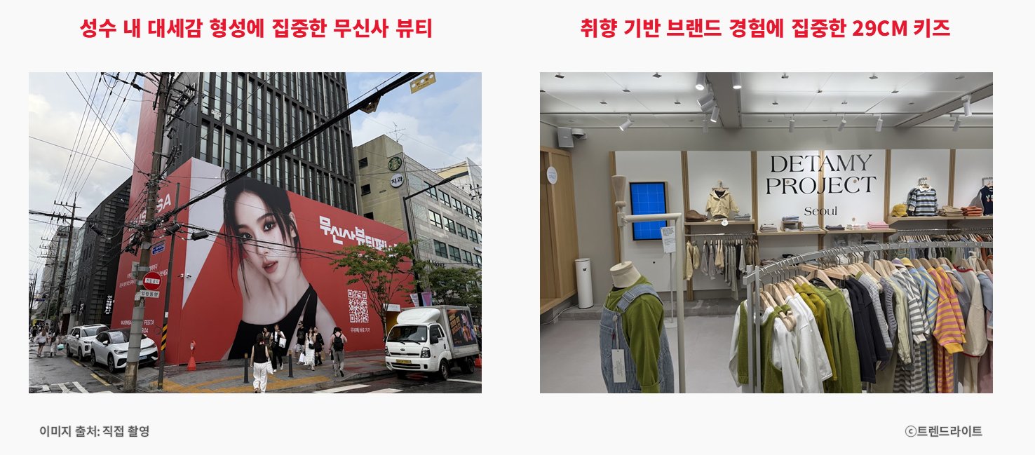 무신사 뷰티 역시 카리나를 모델로 기용했지만, 효과를 극대화한 건 영상 광고가 아니라 성수 전역을 채운 옥외 광고와 현장 경험이었습니다. 작년에는 카리나를 직접 행사장에 불러 화제성을 높이기도 했죠. 29CM 또한 리빙과 키즈 전문 매장을 성수에 열어 브랜드를 직접 체험할 수 있는 공간을 마련했습니다. 단순 인지도를 넘어서 구매 경험까지 주겠다는 전략입니다.