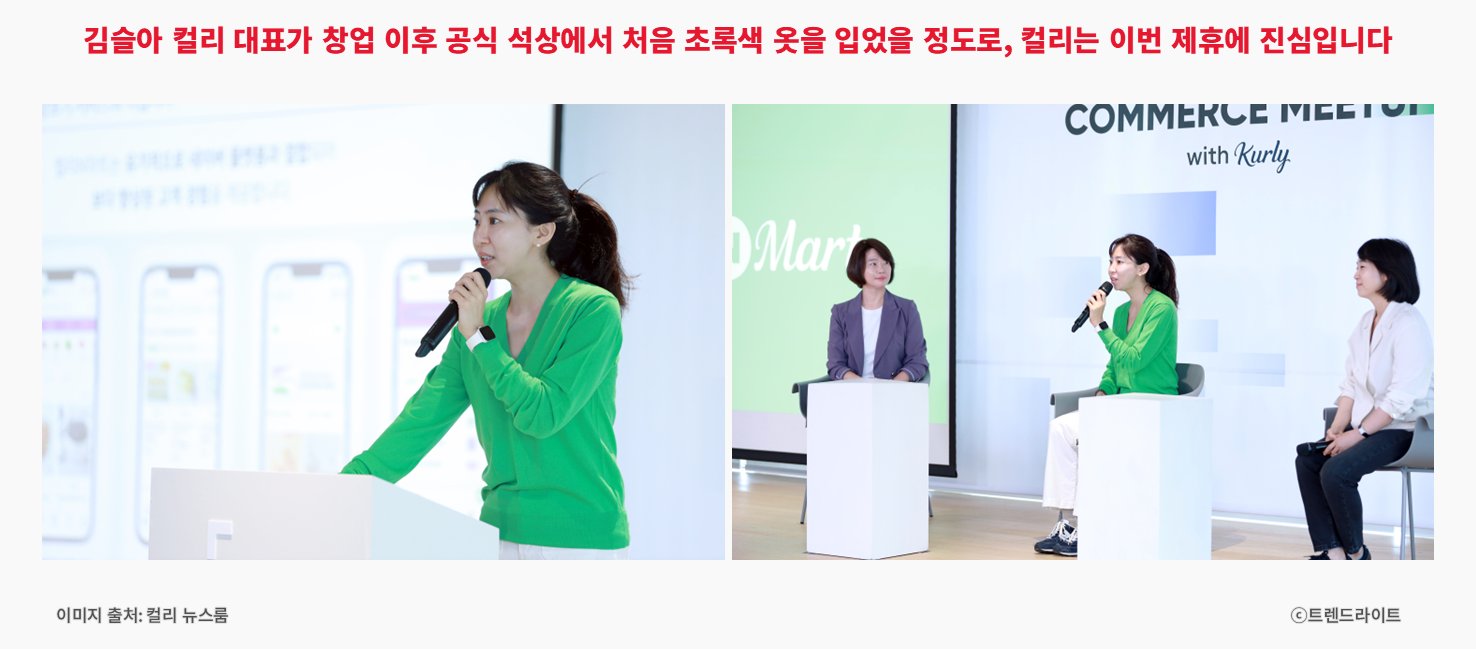 이번 제휴가 컬리에게 얼마나 중요한 의미를 가지는 지는, 김슬아 대표가 직접 네이버 커머스 밋업 무대에 올랐다는 점에서도 잘 드러납니다. 특히 초록색 의상을 입고 등장한 것 역시 매우 상징적이었는데요. 기자가 던진 파트너십에 기대하는 바에 대한 질문에 다음과 같이 답했습니다.