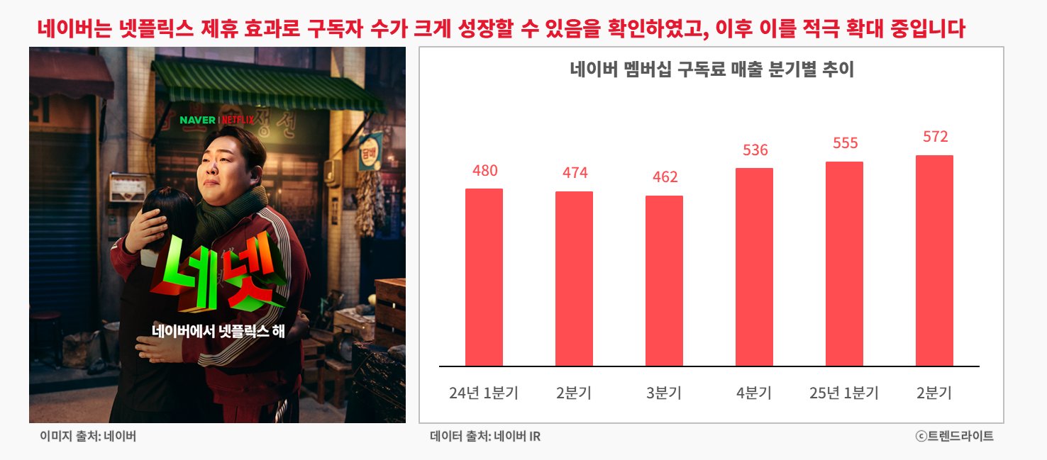 작년 4분기, 넷플릭스 제휴를 시작한 시점 이후 구독 매출은 뚜렷하게 뛰어올랐습니다. 이전까지는 정체와 반등을 반복하던 그래프가, 그때부터는 꾸준히 우상향 곡선을 그리기 시작했죠. 일시적인 반짝 효과가 아니라, 파트너십을 통해 신규 가입자를 끌어오고 동시에 유지까지 가능하다는 게 확인된 겁니다. 그러니 네이버가 파트너십 확장에 더 속도를 내는 건 어쩌면 당연한 수순일지 모릅니다.