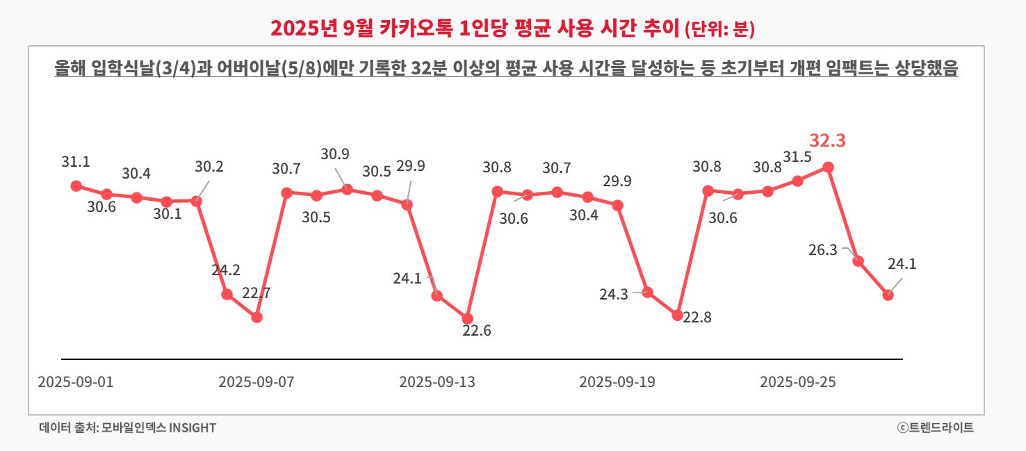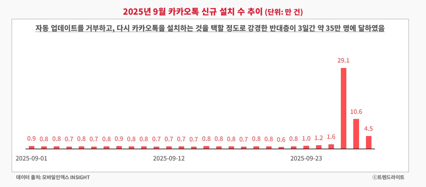 반면 9/26 약 30만 건, 9/27 약 10만 건으로 급증한 카카오톡 ‘신규 설치’는 훨씬 큰 경고였을 겁니다. 이는 진짜 신규 유입이라기보다, 업데이트를 피하려는 재설치가 대거 발생했음을 뜻합니다. 즉, 적극적 반대층의 규모와 결집이 수치로 확인된 셈이죠. 이 지점에서 “원복 하자”는 내부 목소리에 힘이 실렸고, 결국 철회가 결정되었던 건 아닐까요?