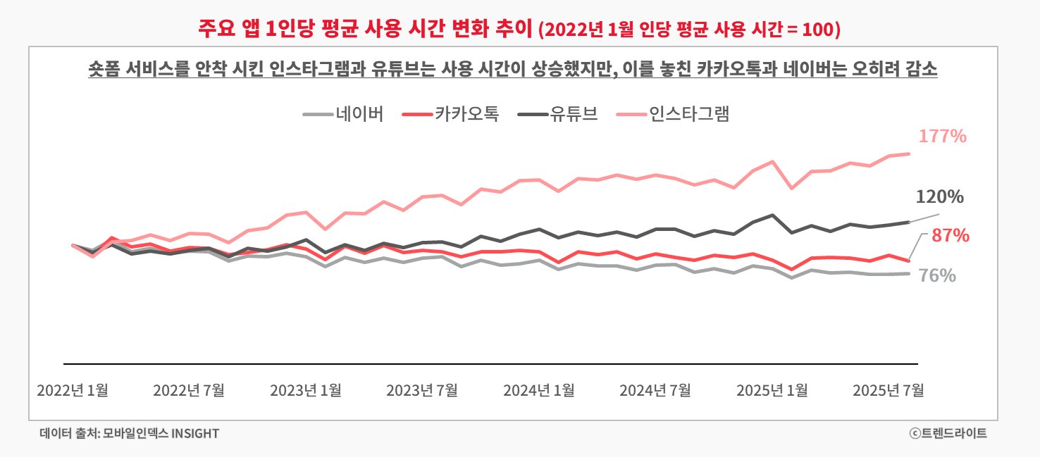 2021년 2월 인스타그램 릴스, 같은 해 12월 유튜브 숏츠가 본격화되며 국내에도 숏폼의 시대가 열렸습니다. 이를 기점으로 유튜브·인스타그램의 1인당 사용 시간은 꾸준히 우상향 했지만, 카카오톡과 네이버는 여전히 제자리걸음이었습니다. 두 서비스는 이미 설치율이 포화에 가까워, 체류 시간 정체가 곧 광고 매출 정체로 이어질 수밖에 없었죠.