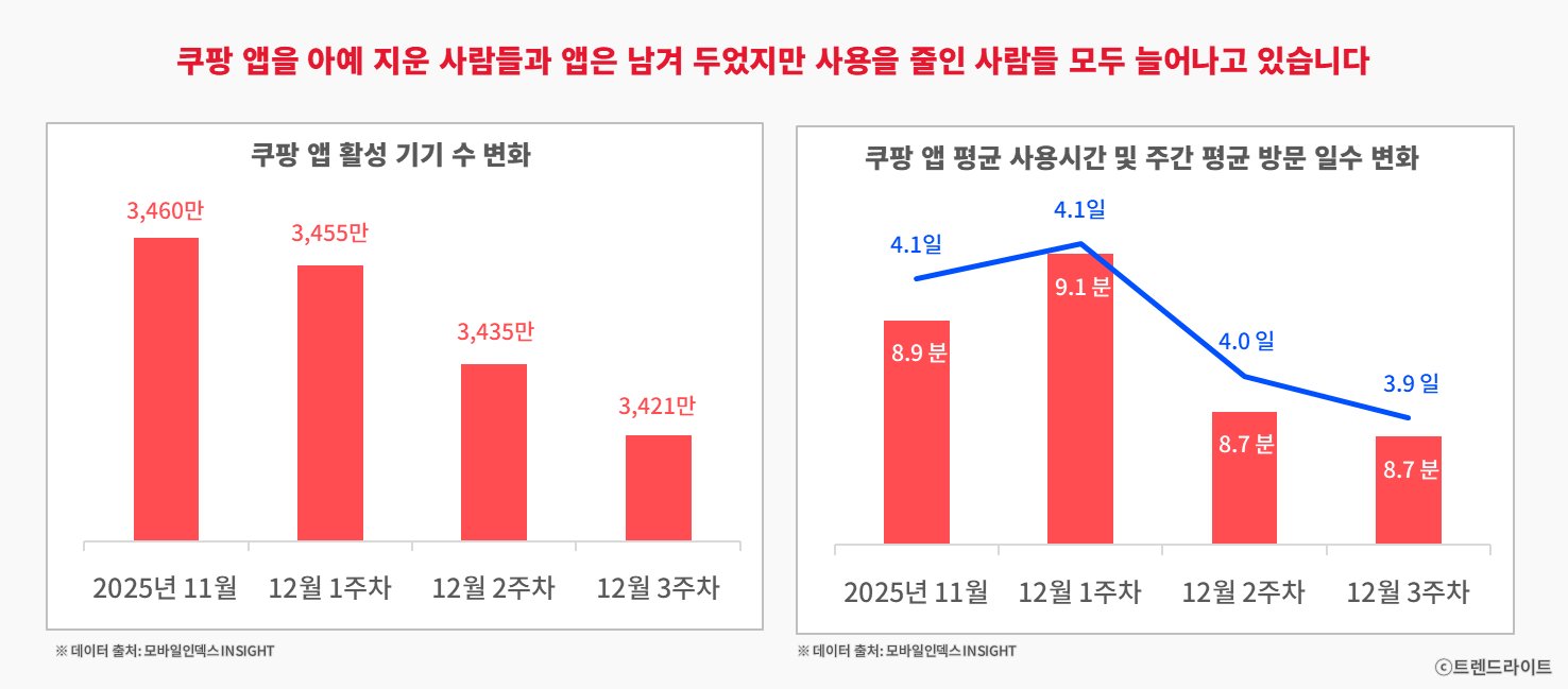 쿠팡은 올해 하반기 내내 이 지표가 매달 조금씩이라도 성장해 왔습니다. 그런데 12월 들어 흐름이 달라졌습니다. 12월 1주차에는 11월 대비 -0.2%, 2주차 -0.7%, 3주차에는 -1.1%까지 감소 폭이 점점 커졌습니다. 숫자로 환산하면 최소 약 40만 명 이상이 쿠팡 앱을 완전히 삭제한 셈입니다.