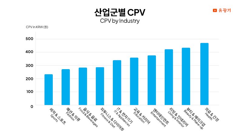 예를 들어, 레저·스포츠, 패션 &의류,피트니스·다이어트 용품 판매 브랜드는 CPV가 평소 매우 효율적입니다. 이 말은 곧, 같은 비용을 쓰더라도 더 많은 시청자에게 도달할 수 있다는 뜻이죠.
