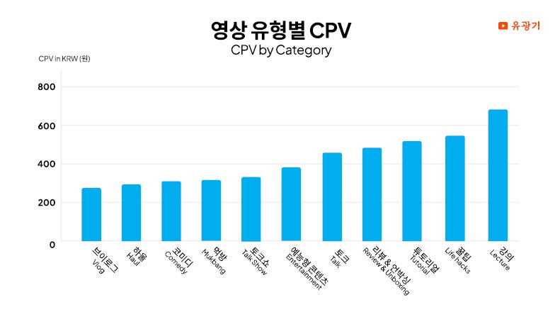 먹방, 브이로그, 하울은 낮은 CPV를 보여줍니다. 이 유형들은 반복 소비가 많고 진입장벽이 낮은 포맷이라 조회수 확보에는 유리하죠. 반대로 강의, 튜토리얼, 예능형 콘텐츠는 높은 CPV를 기록하는데, 이는 정보 전달이나 제작 난이도가 높아 시청자 풀이 제한적이기 때문입니다.