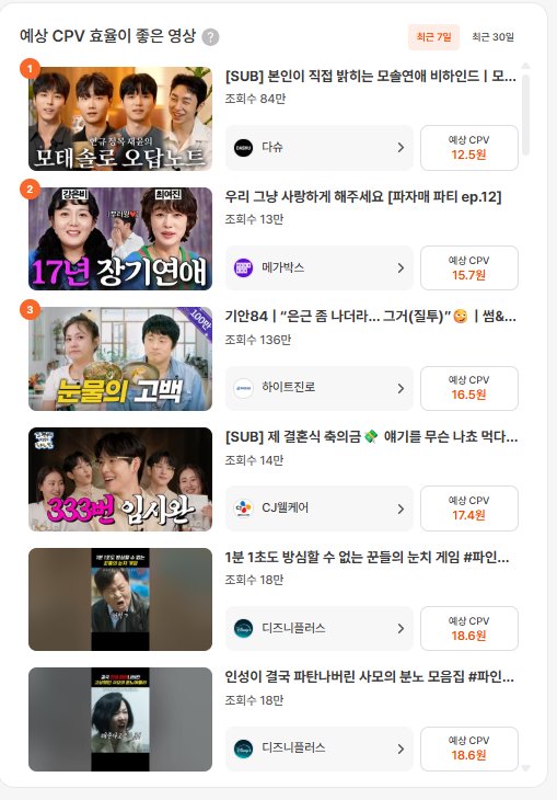 협찬 단가와 예상 CPV까지 데이터 기반으로 확인