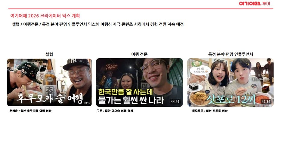 여기어때는 유튜브를 단순한 브랜딩 채널이 아니라, 여행 욕구를 실제 행동으로 이어지게 만드는 출발점으로 설계했습니다. 콘텐츠를 본 사람이 “재밌다”에서 멈추는 게 아니라, “나도 저 여행을 해보고 싶다”까지 자연스럽게 이동하도록 만드는 것이 핵심이죠. 이걸 저희는 “여기어때와 맞는 크리에이터”라고 불렀습니다.