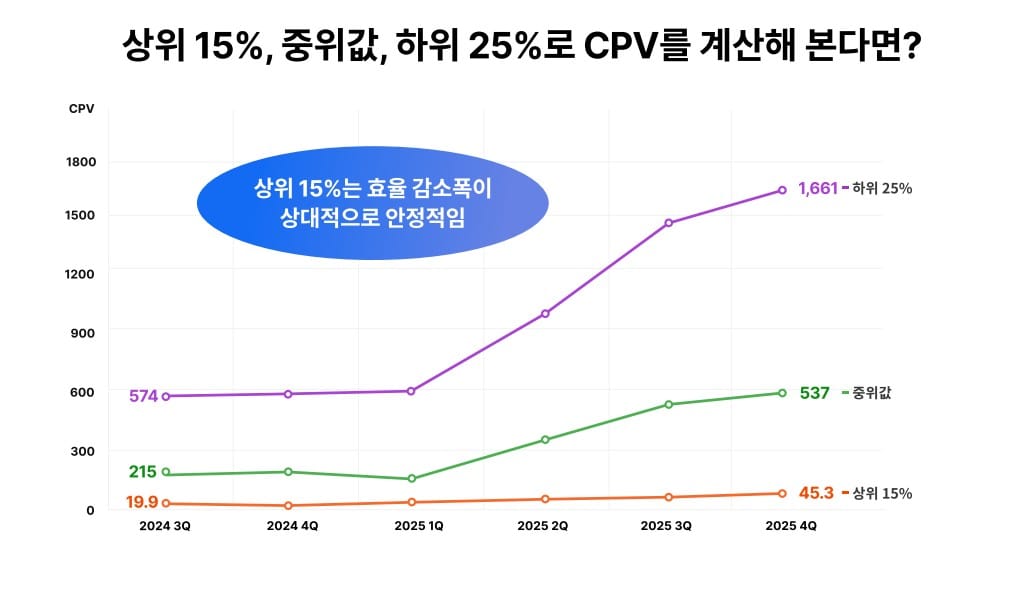 다만 모든 콘텐츠가 같은 속도로 무너진 것은 아닙니다. 중·하위권 콘텐츠의 효율은 2배 이상 급격히 악화된 반면, 상위 15% 콘텐츠는 비교적 안정적인 효율을 유지하고 있습니다.